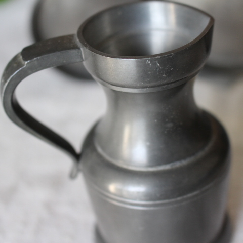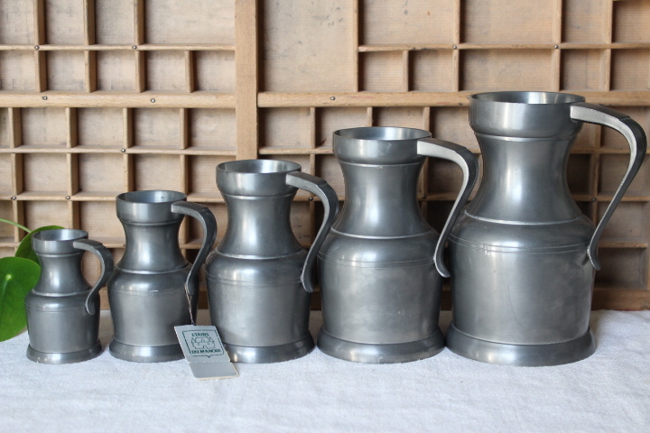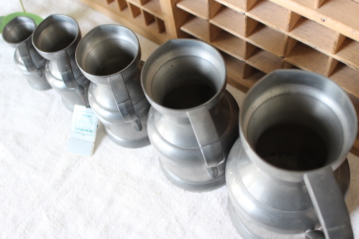 フランスの蚤の市で見つけました、ピューター製ピッチャー5点セット。