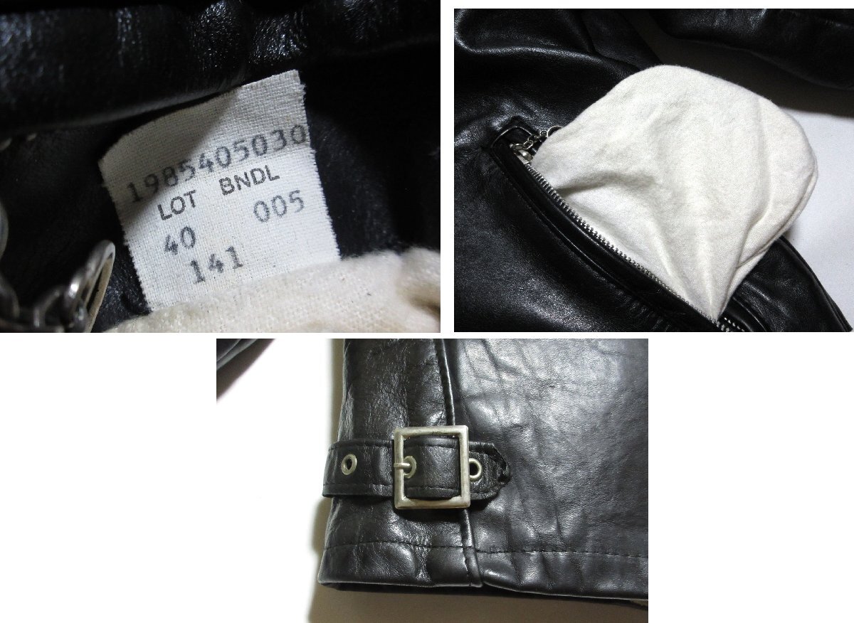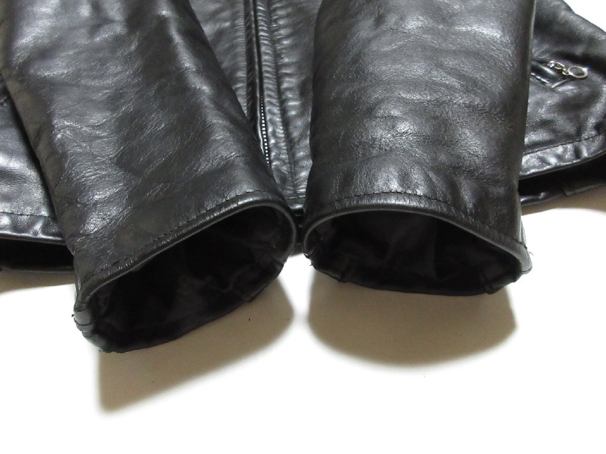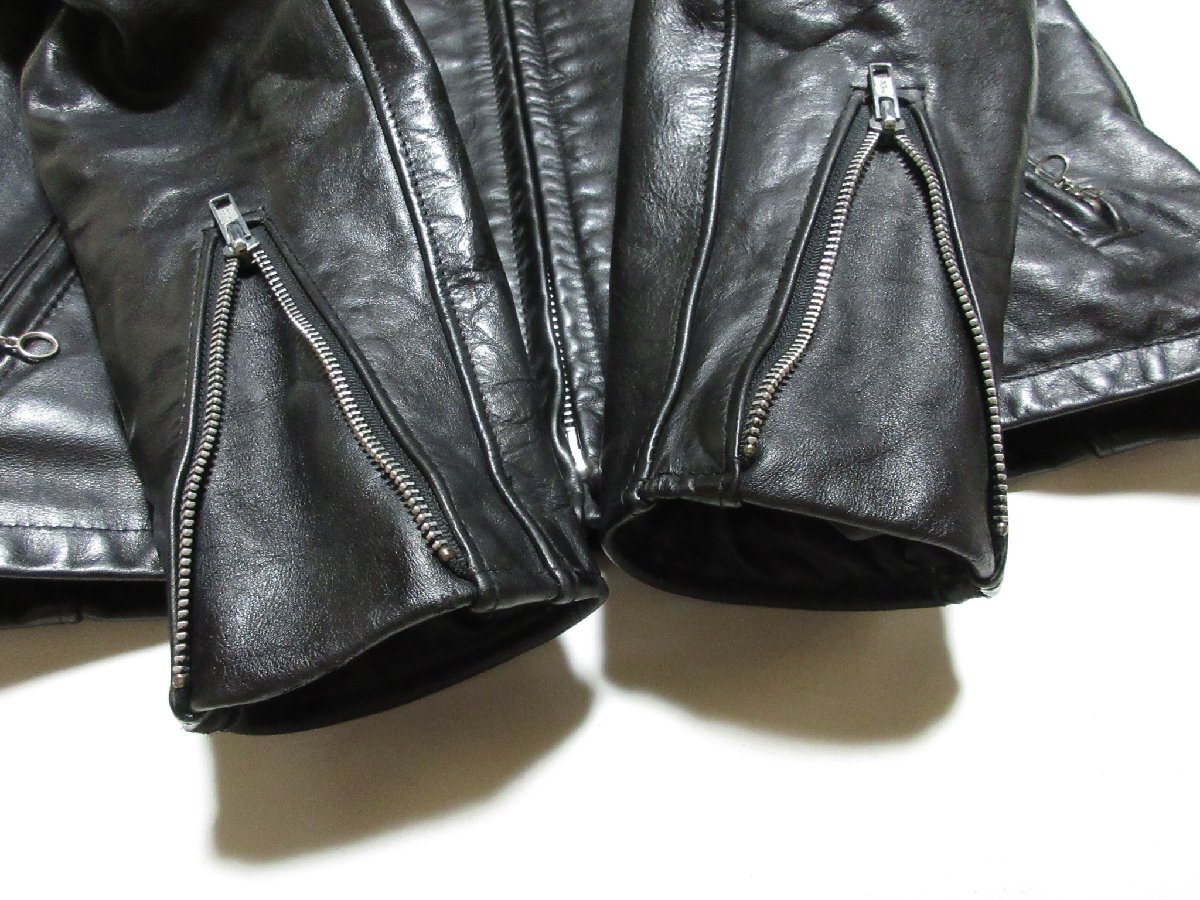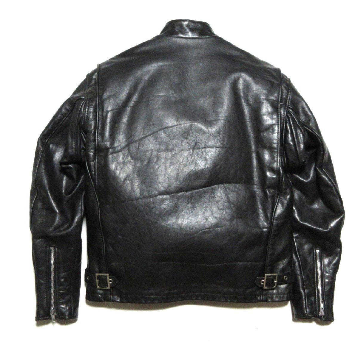 ●MADE IN USA/米国製 | ●Model:141 ●素材:牛革、裏地/ナイロン100%、ライナー/アクリル100% ●カラー:ブラック ●サイズ表記 40 *実寸(平置き 約㎝) ・袖丈 60 (肩ステッチから袖先) ・肩幅 51 (肩ステッチから肩ステッチ) ・身幅 58 (脇下から脇下) ・着丈 64 (後ろ襟元付け根から裾) (※袖丈、身幅はフロント側から、肩幅、着丈は背中側をラインに沿って測定しています。多少の誤差はご了承下さい) オイルドカウハイドの141。シボが刻まれた革質の良い個体です。定番モデル641と比べ柔らかめのレザーでバイカーの方は勿論タウンユースとしても最適です。ライナーは脱着可能。米国製。