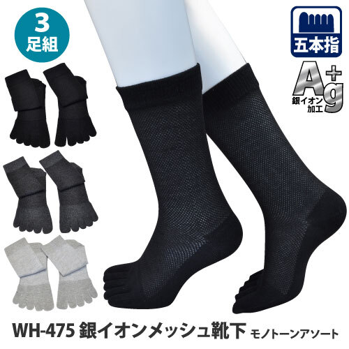 ユニワールド WORKS HOMME【 WH-475】銀イオン メッシュ靴下★五本指★3足組 ■24.5-27.0cm■ ネコポス(ポスト投函)発送※1便2組発送可能