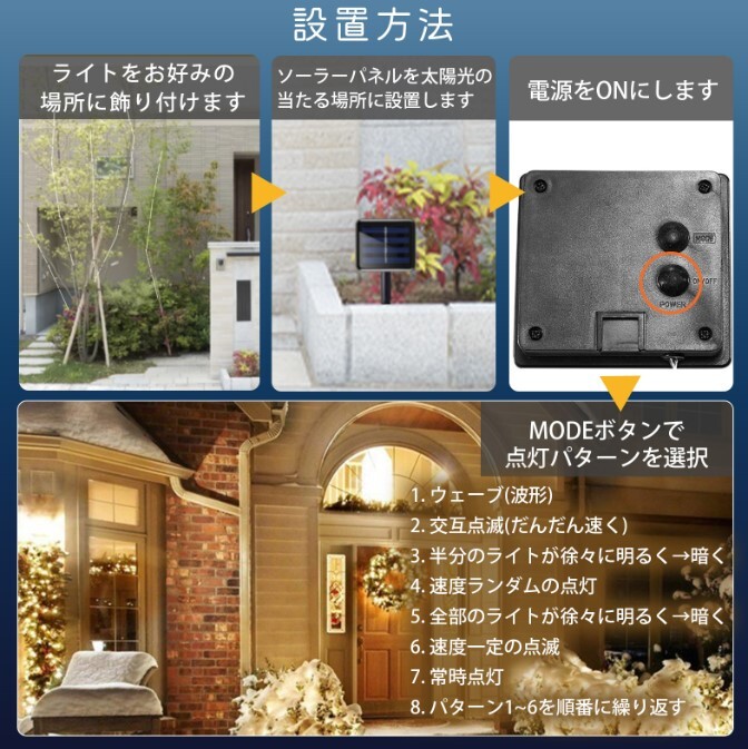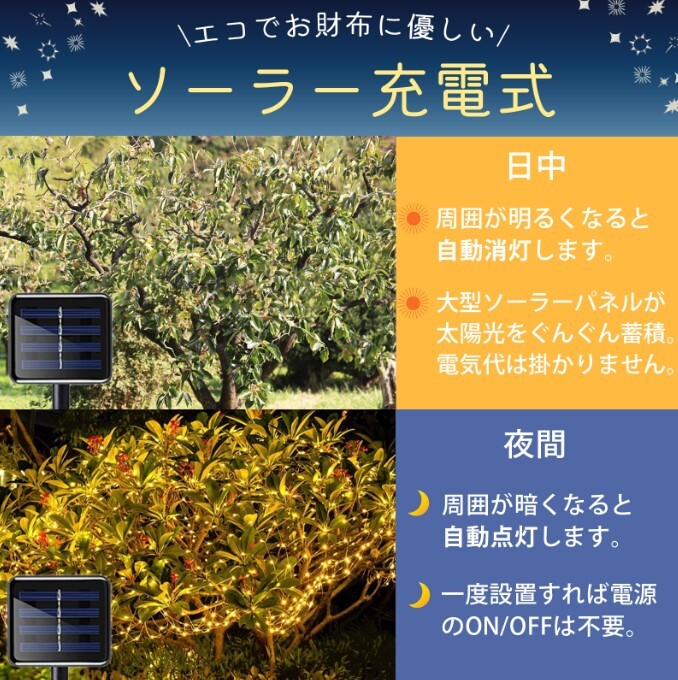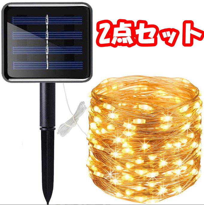 【2点セット】イルミネーションライト ソーラーライト 防水 100LED 12m 大型パネル 最大10時間点灯 8パターン点灯