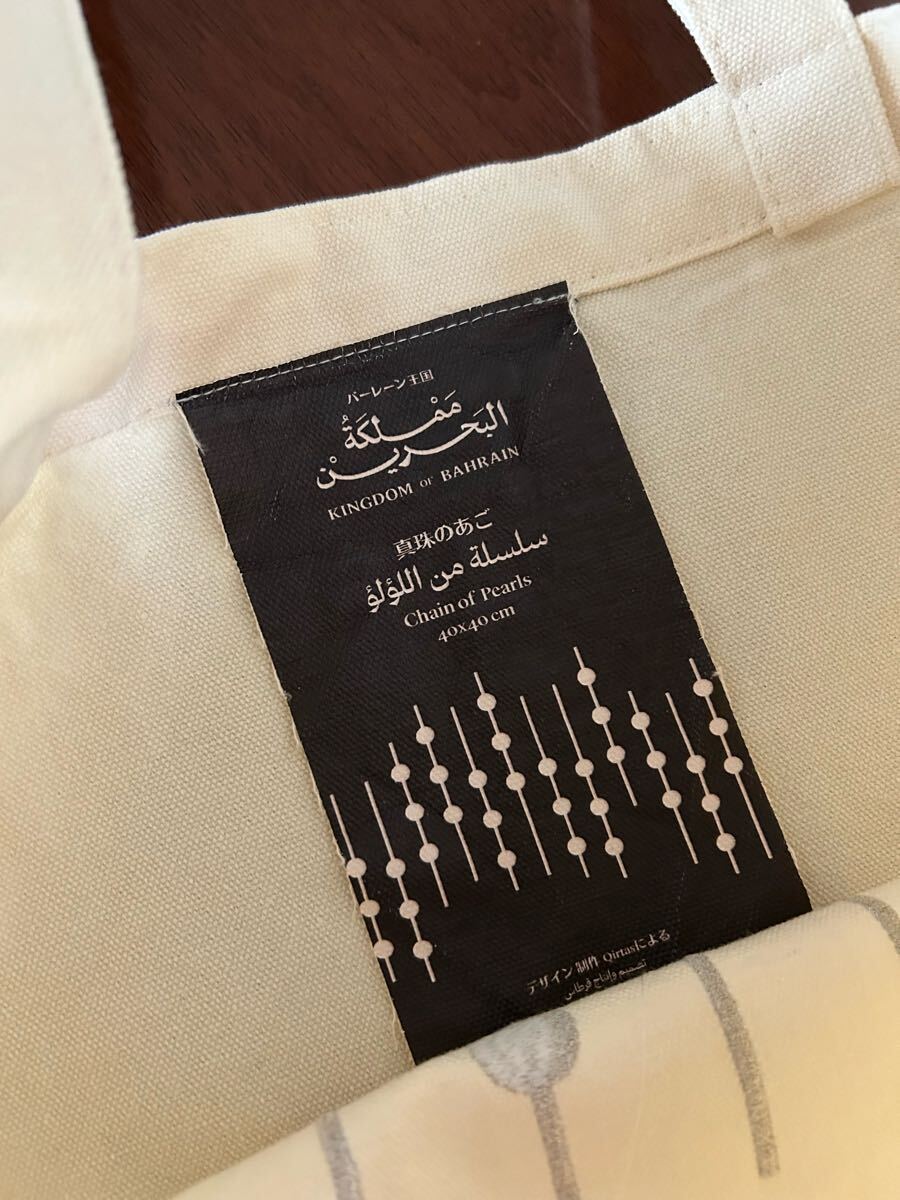 関西万博のバーレーンパビリオン購入のエコバッグです。真珠モチーフの刺繍がほどこされていて、カジュアルながらも上品な雰囲気です。
