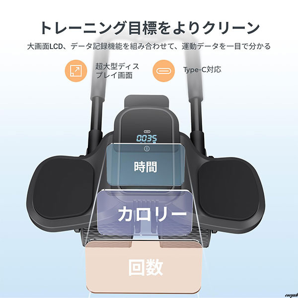 LCDディスプレイで回数・時間・消費カロリーをリアルタイムで確認でき、Type-C充電対応で手軽に使えます。