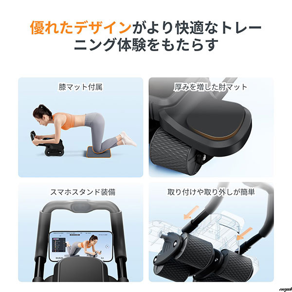 厚みのある膝・肘マットとスマホスタンド付きで、快適かつ楽しくトレーニングが続けられます。