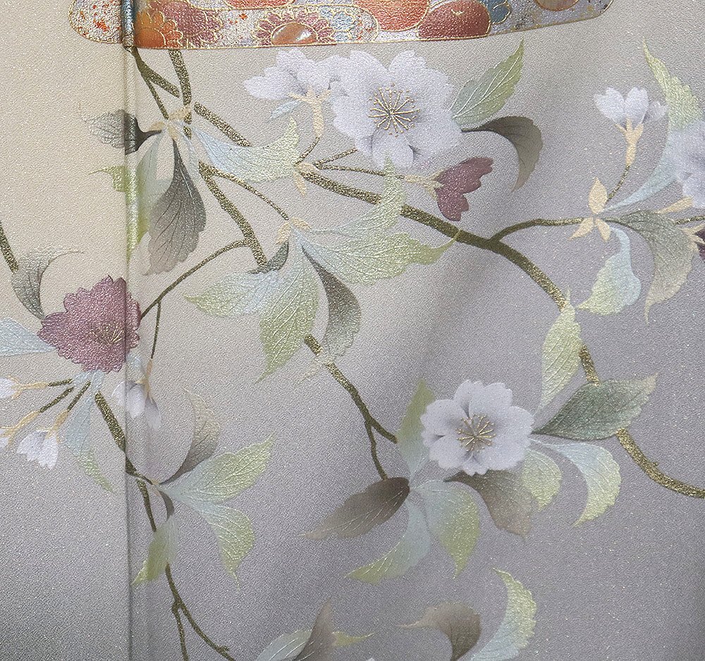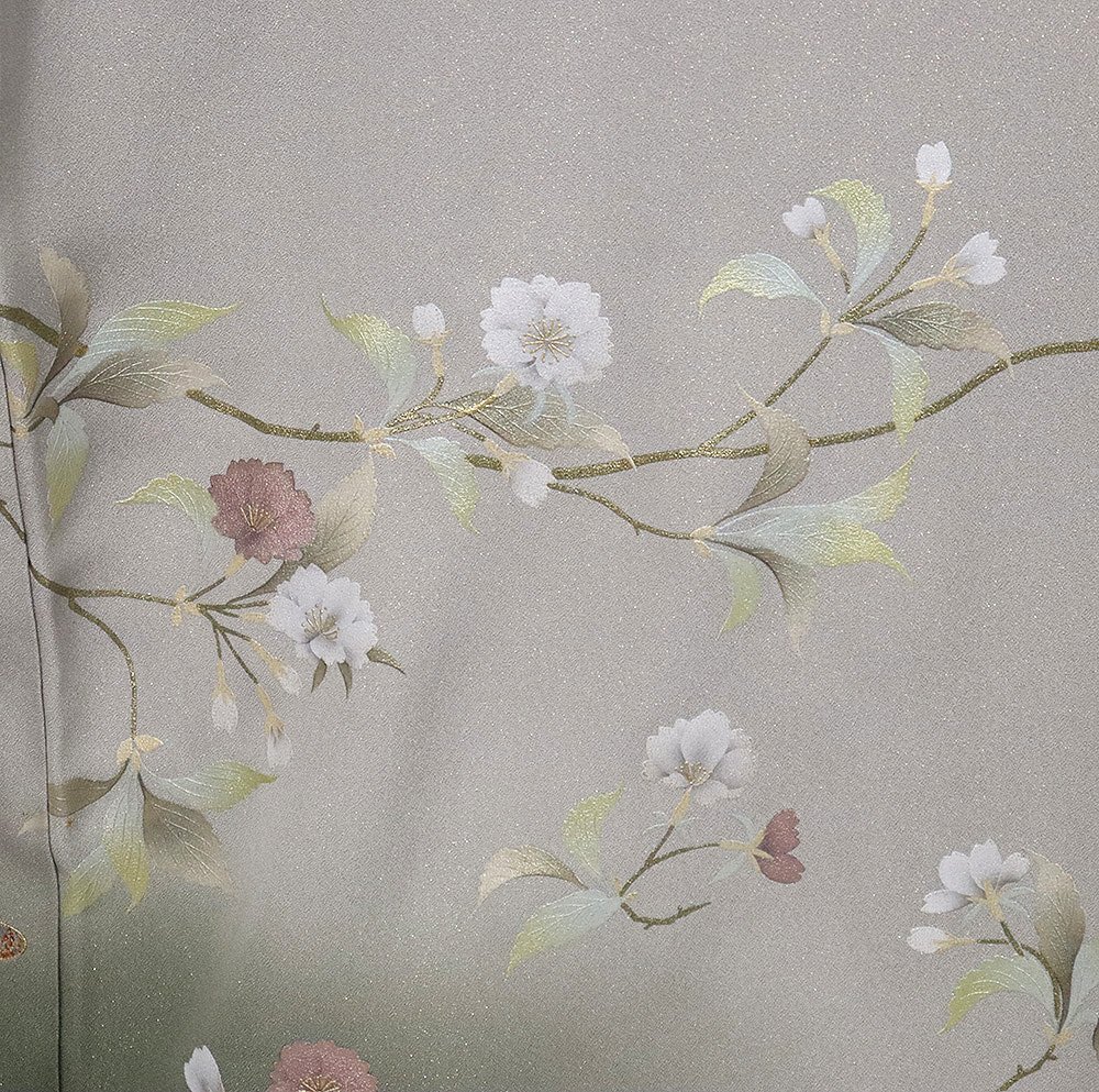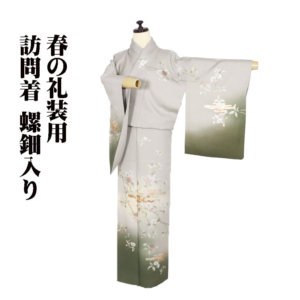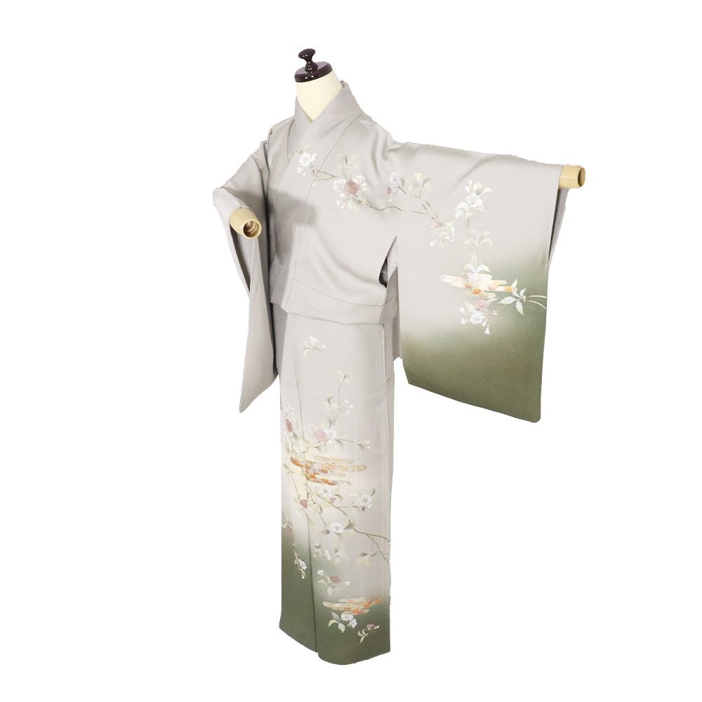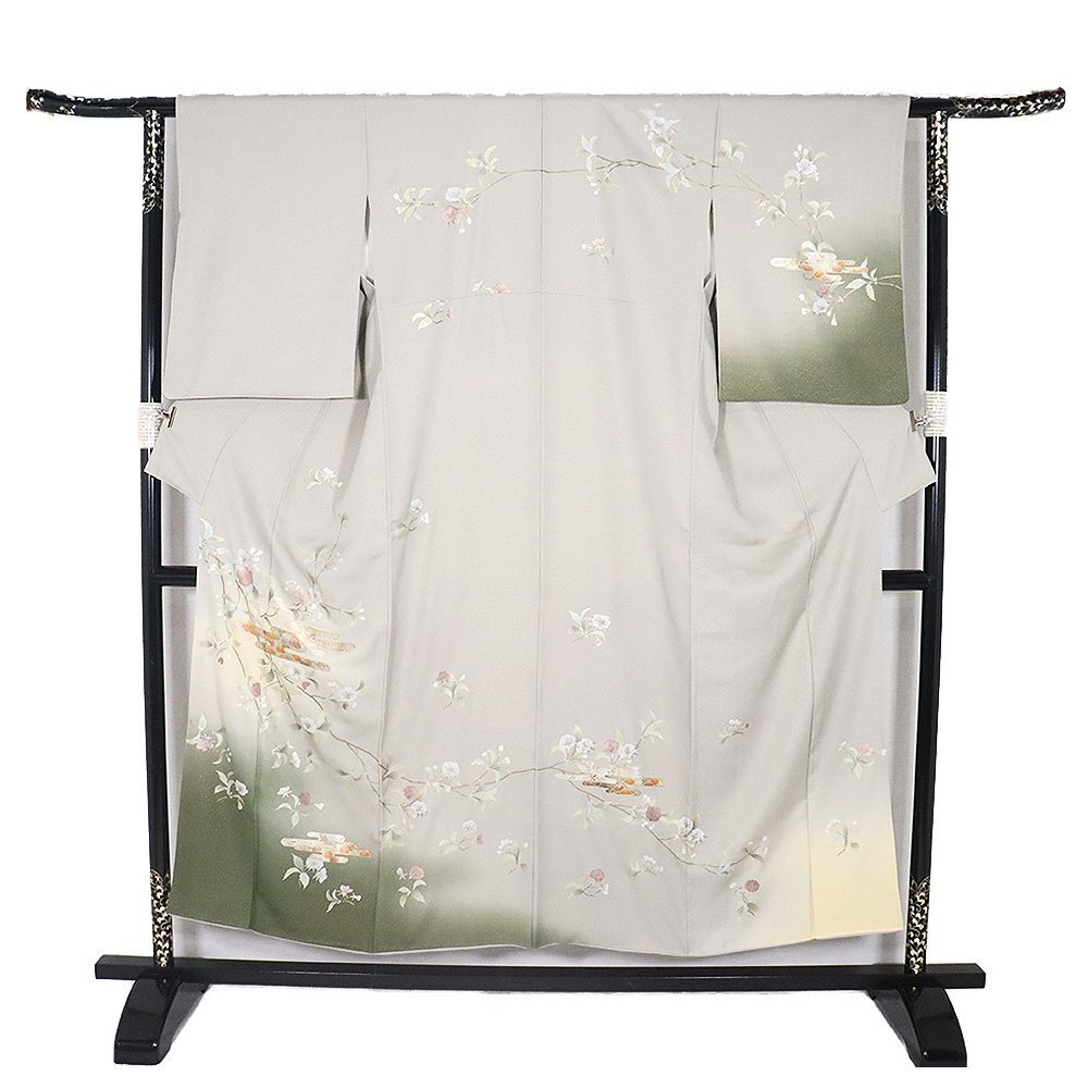 | 訪問着 袷 丹後縮緬地 グレー(利休白茶色)・緑(海松色)・クリーム(蜂蜜色) 暈し・金糸通し地 濡れ描き・桜 金箔・万寿菊・霞文 螺鈿入り 158 広襟 |