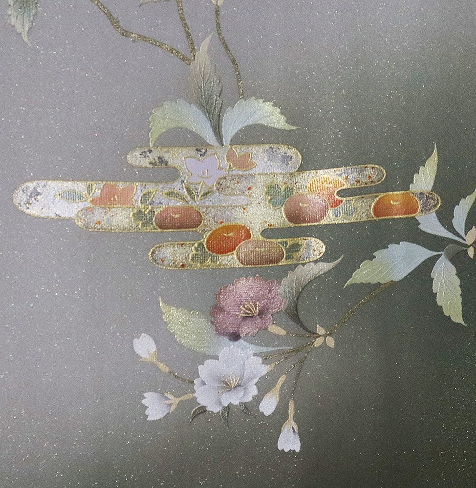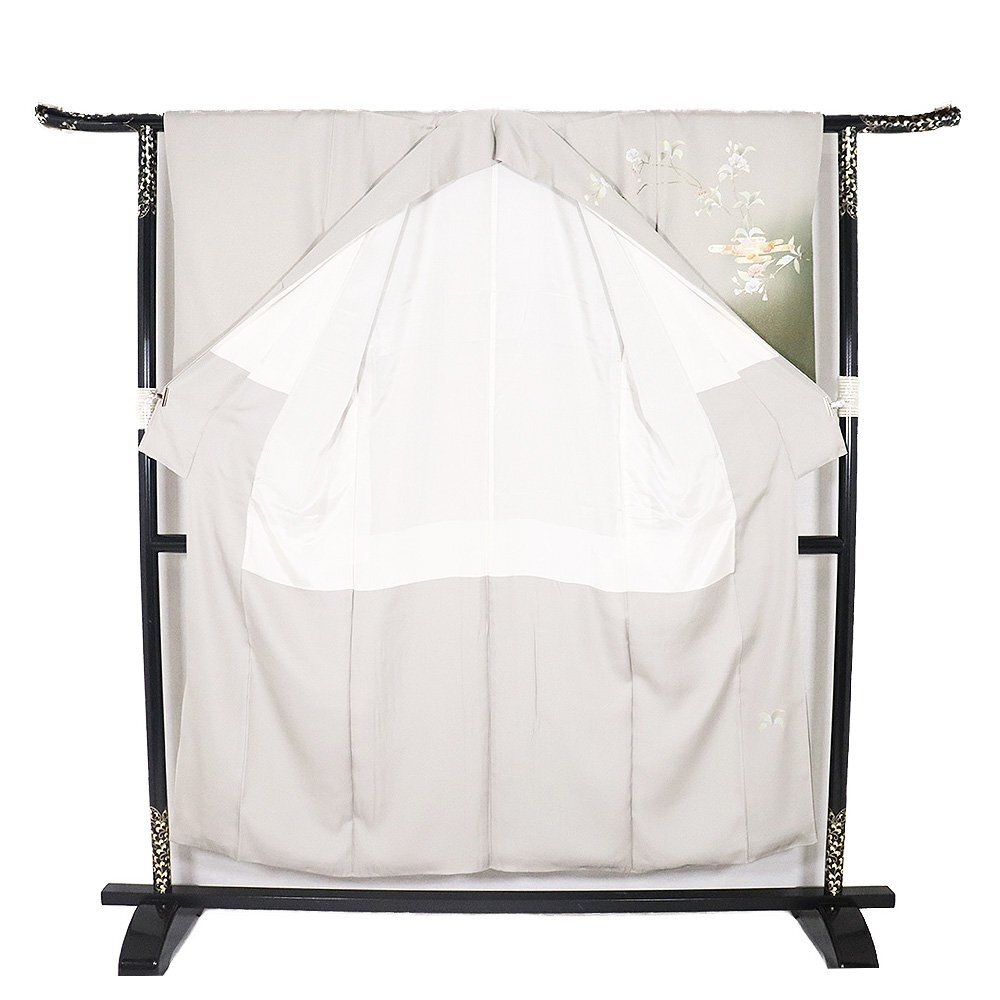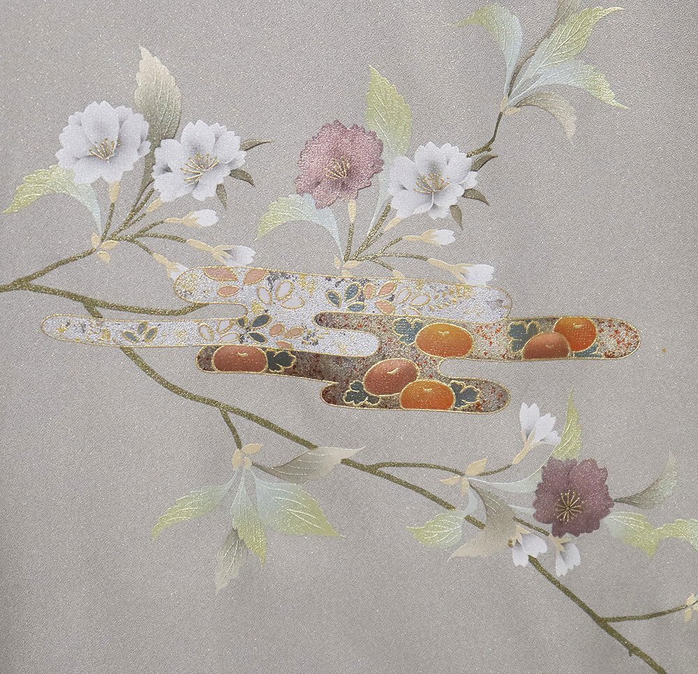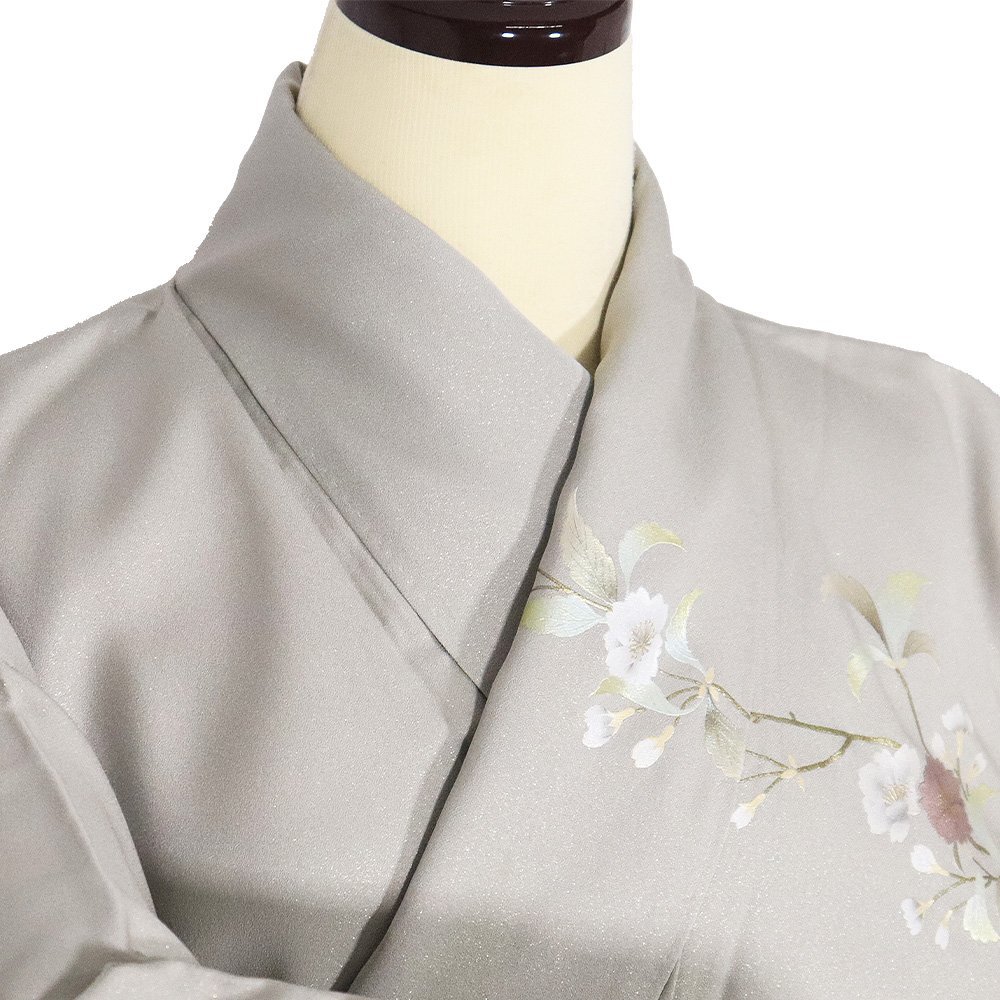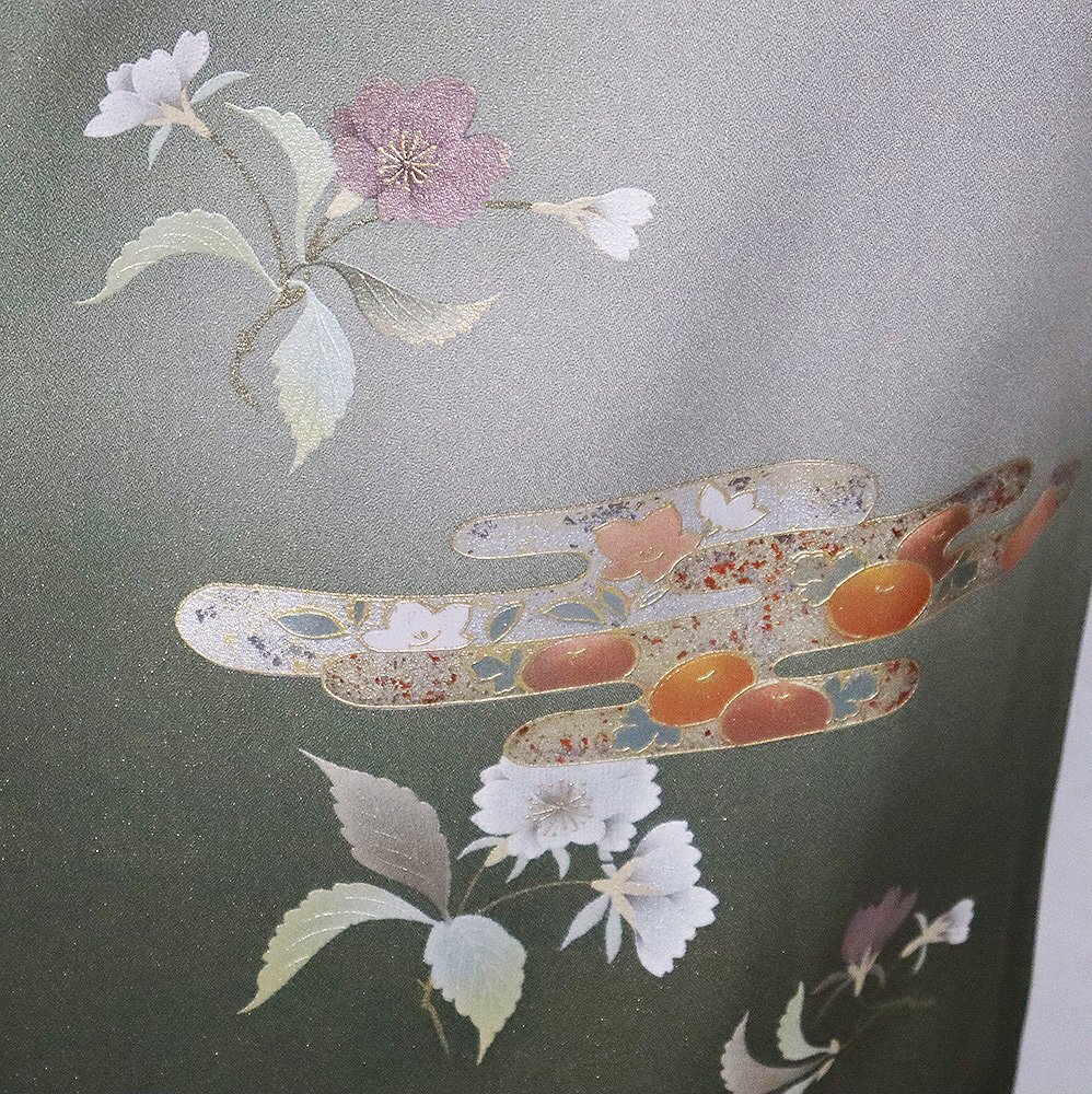 | 訪問着 袷 丹後縮緬地 グレー(利休白茶色)・緑(海松色)・クリーム(蜂蜜色) 暈し・金糸通し地 濡れ描き・桜 金箔・万寿菊・霞文 螺鈿入り 158 広襟 |