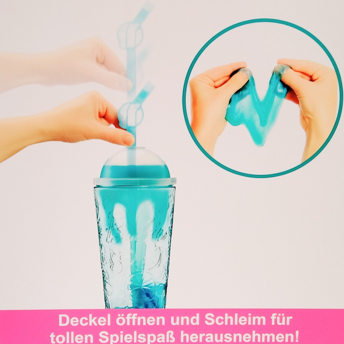 お子様は外側のパッケージを取り外し、カップを開けてサプライズバッグを取り出し、蓋を閉めてストローのようなパーツで蓋を開けると、氷の上にふわふわの青いスライムが飛び出します!