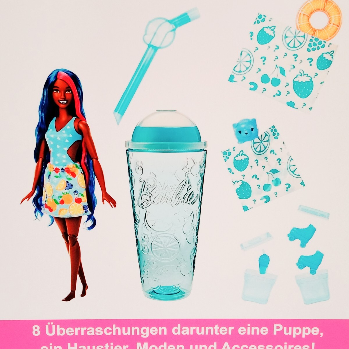 バービー人形は長く青い髪をしており、フルーツをテーマにしたショートパンツと、香りのするふわふわのペットが付属しています。