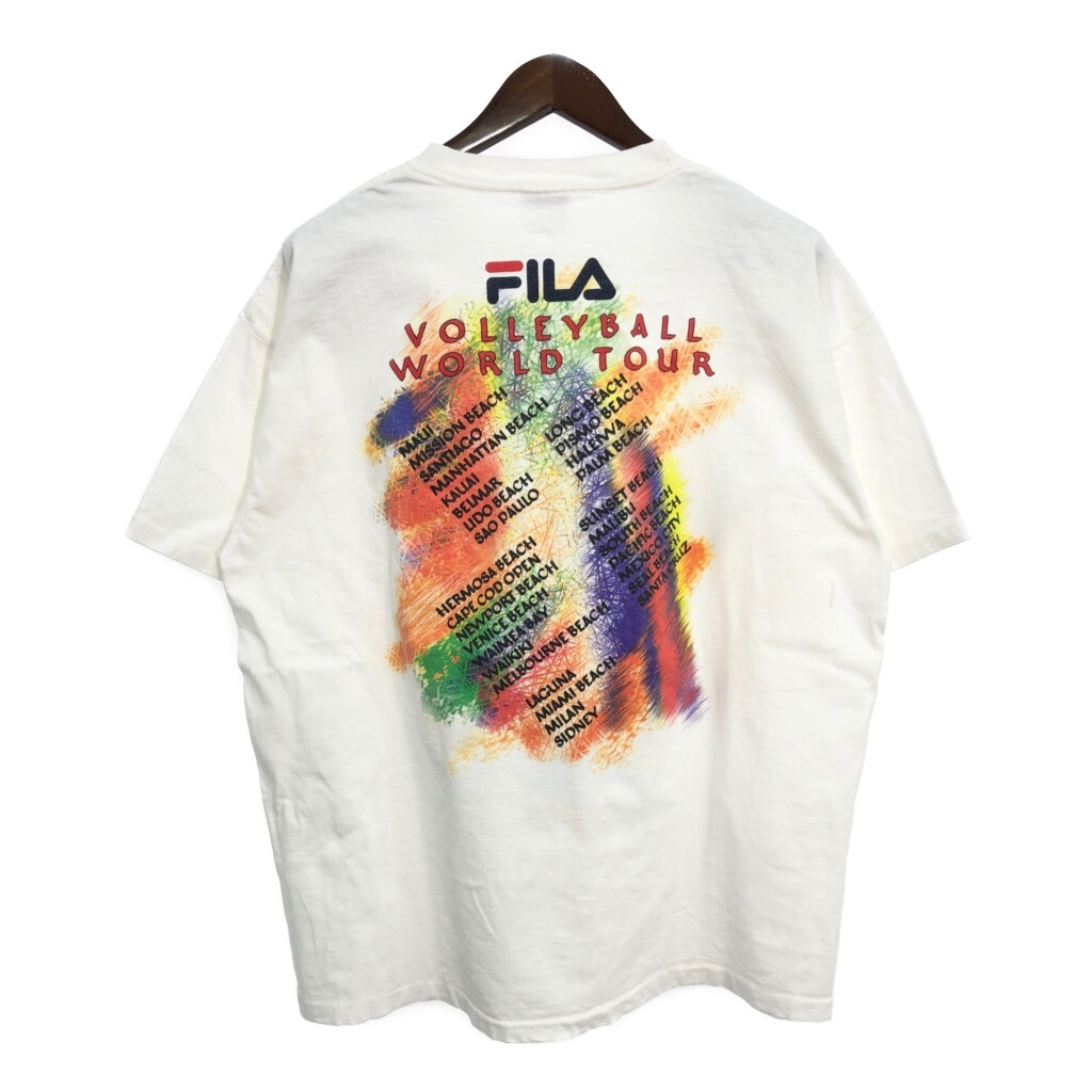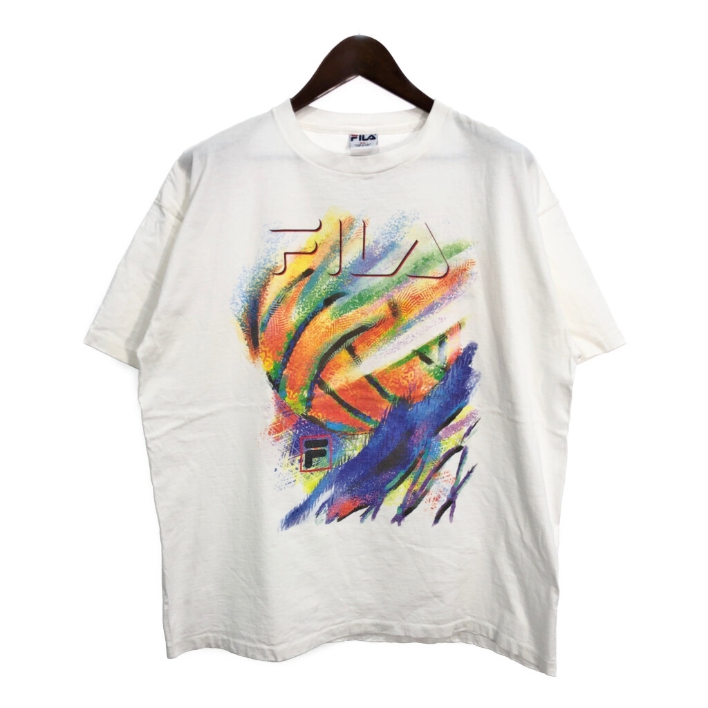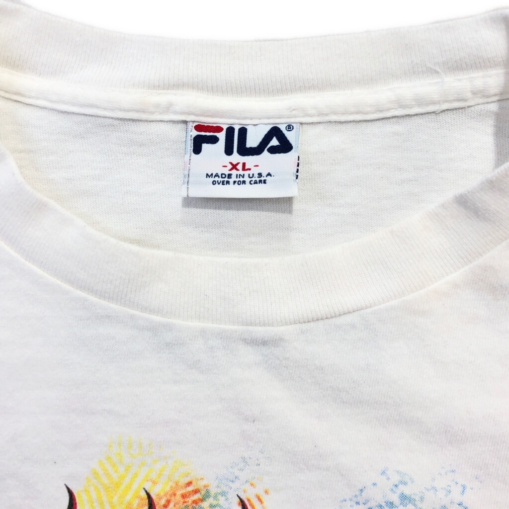 【商品管理番号】 T4296 【ブランド】 FILA/フィラ 【サイズ】 XL 【実寸サイズ】 肩幅:約61cm 着丈:約74cm 身幅:約63cm 袖丈:約21cm 【主な素材】 表地 : コットン 【色】 ホワイト 【仕様】 生産国 : USA製 90年代 シングルステッチ スポーツ 【状態】 汚れ:首元、背中 特記事項:色移り |