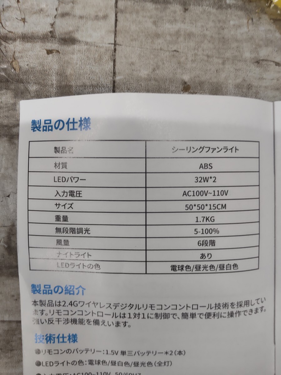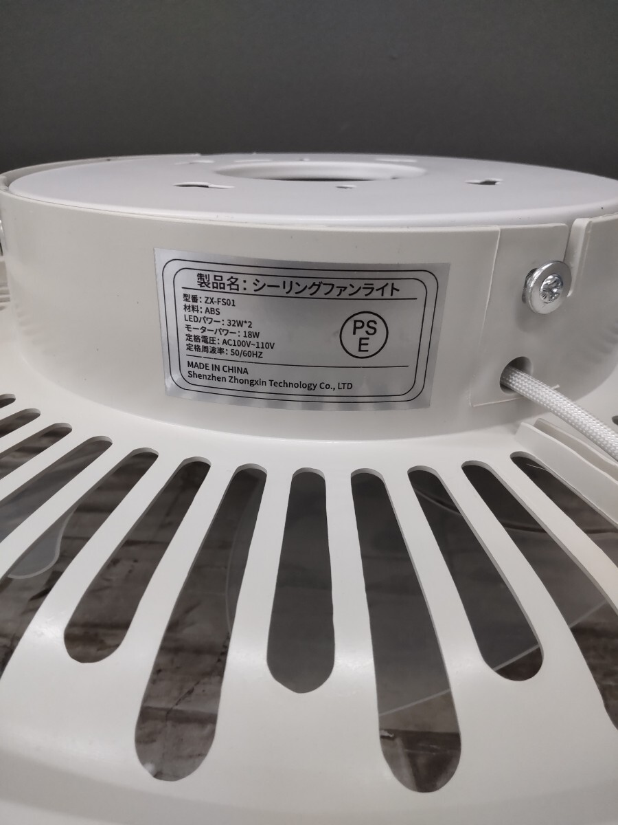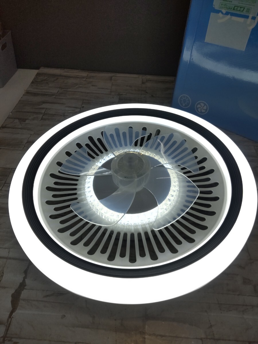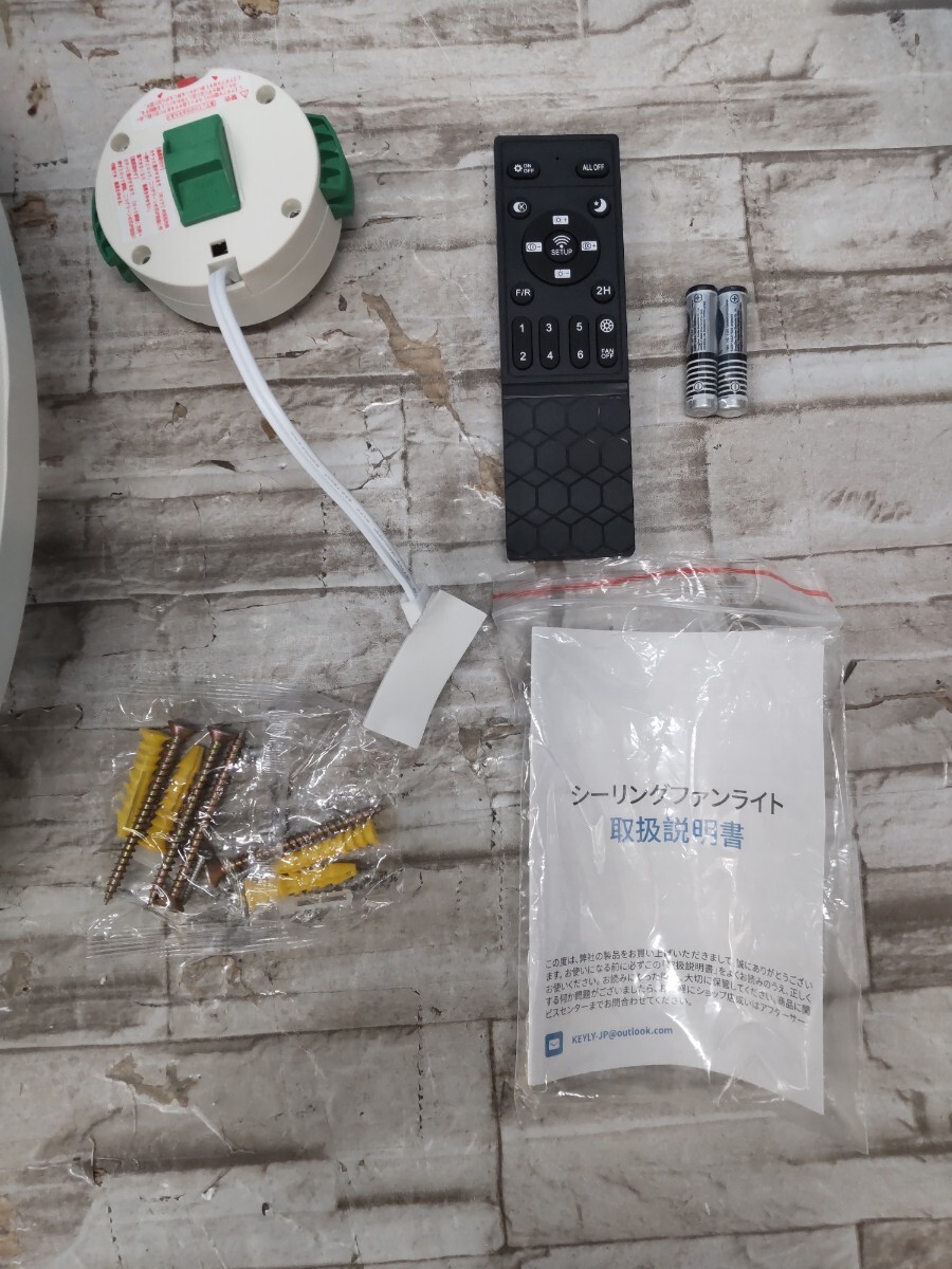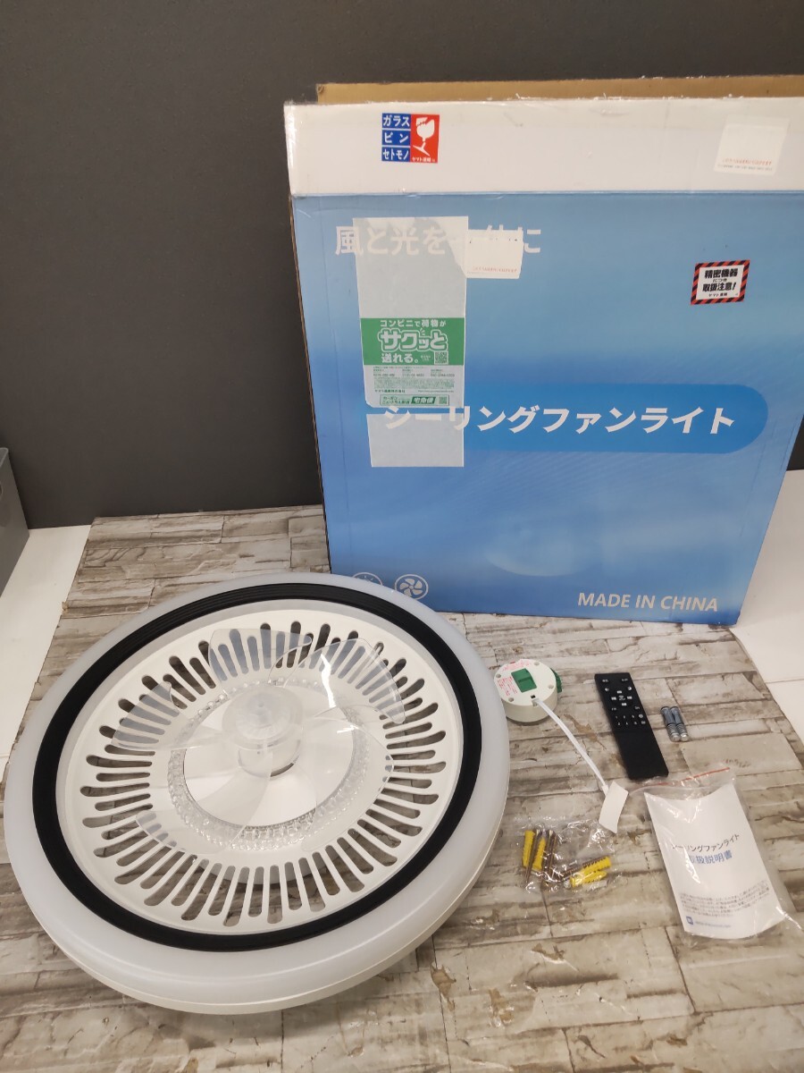 通電、1分程度のファン回転、風量調節、1分程度の点灯、調光、調色、簡単なリモコン操作の確認までしました。