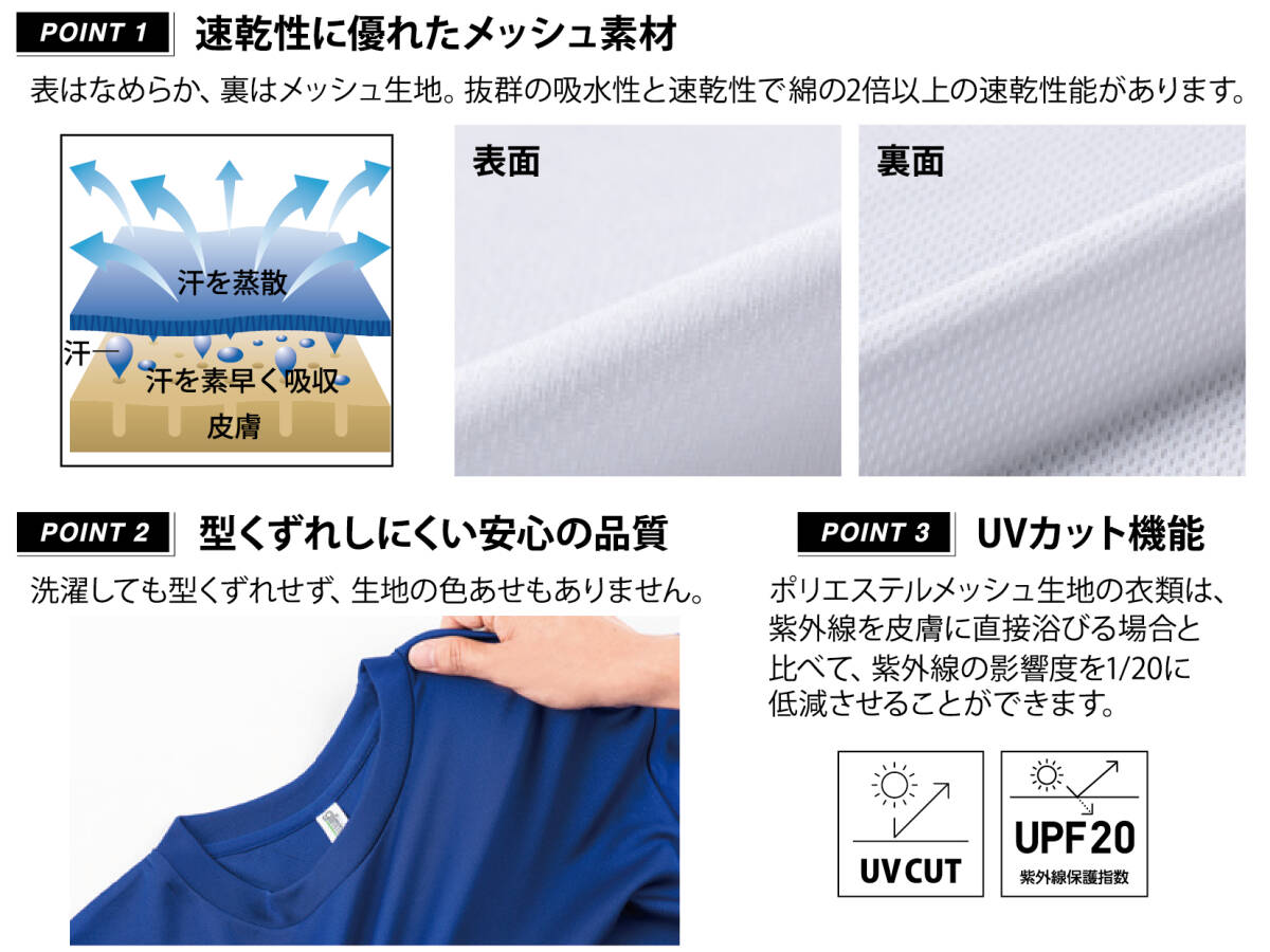 | ★ドライTシャツのパイオニア!!人気No,1のドライTシャツ 速乾性に優れたメッシュ素材で、表はなめらか、裏はメッシュ生地。抜群の吸水性と速乾性で綿の2倍以上の速乾性能があります。 洗濯をしても型崩れしにくい安心の品質で、色褪せもしにくい生地です。 さらっとして着やすく、UVカット機能で真夏も夏以外でも大変重宝します。 |