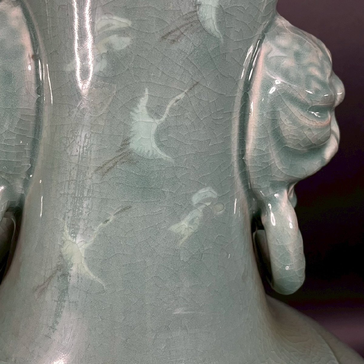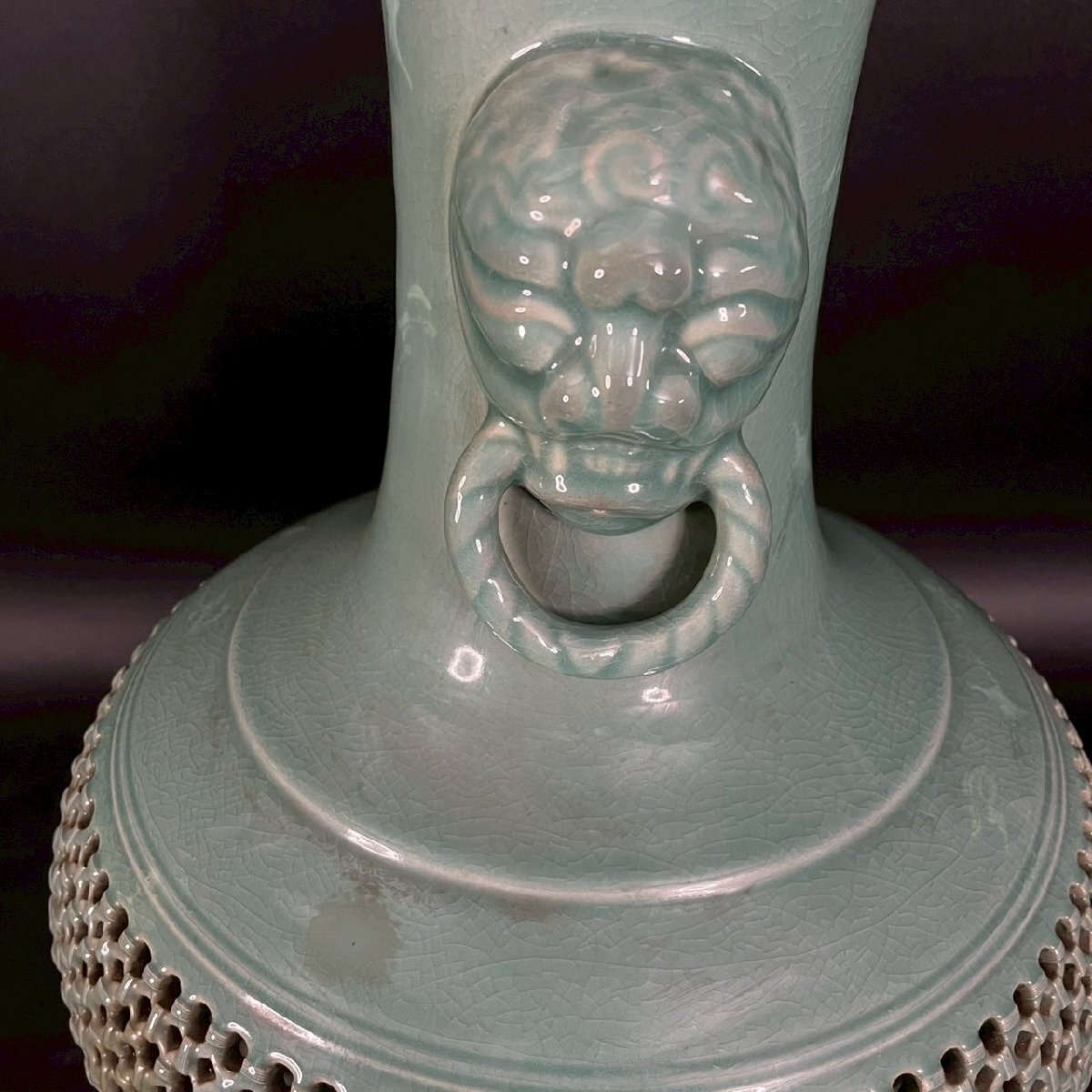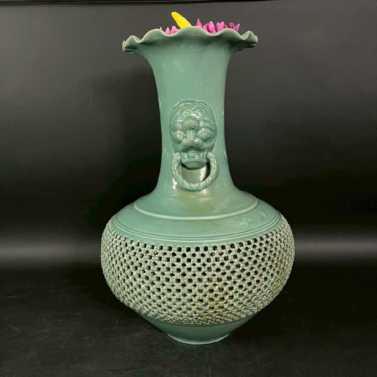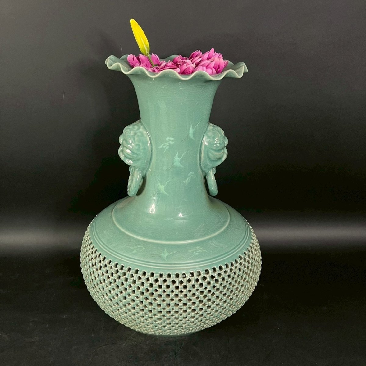 OM0811-2‐3 大型 花瓶 花器 高麗 青磁 陶器 陶芸 透かし彫り 雲 鶴 天江 置物 伝統 工芸 骨董品 造花 高さ61㎝ 口径13㎝ 佐川180サイズ