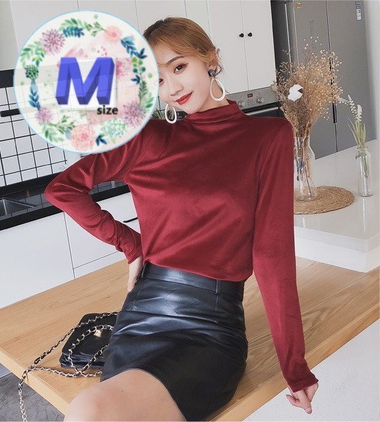 良質とろみベロア素材 ハイネックカットソー Mサイズ 美ライン 長袖 レディース タートルネック ロンT 無地 綺麗め K-091-6ワインレッド