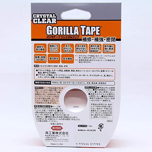 「Gorilla Glue ゴリラ強力多用途補修テープ クリスタルクリア 48mm×8.2m」▼4972444017783▼(商品説明)・クリスタルクリア No.1778・・Color:クリスタルクリアPatternName:単品・原産国:アメリカ合衆国・用途:さまざまな箇所の補修、補強、密閉・使用温度範囲:-20~60度・使用できないもの:特殊加工面、油分を多く含んだ合成ゴム、写真、貴金属・見た目を損なわないクリアタイプ屋外、水中もOK!さまざまな素材・使用環境で硬化を発揮! 超耐久強力接着 見た目を損なわないクリアタイプ 耐寒・耐熱(-20~60℃) 曲面にもぴったりフィット 濡れた面・水中でもOK 強力防水、手できれいに切れる、紫外線に強く黄変しない、全天候型 ※恒久的な目的では使用しないでください。 ※電気絶縁用としては使用しないでください。 ※人体には使用しないでください。 ※剥がす際に接着面を傷めたり、のりが残る場合があるので注意してください。 ※過度な圧力がかかる箇所には使用しないでください。 ※長期間過度な熱がかかるとテープが黄変する場合があります。 ※汚れがない平滑面に貼り、テープの下に水が残った場合は押し出してください。