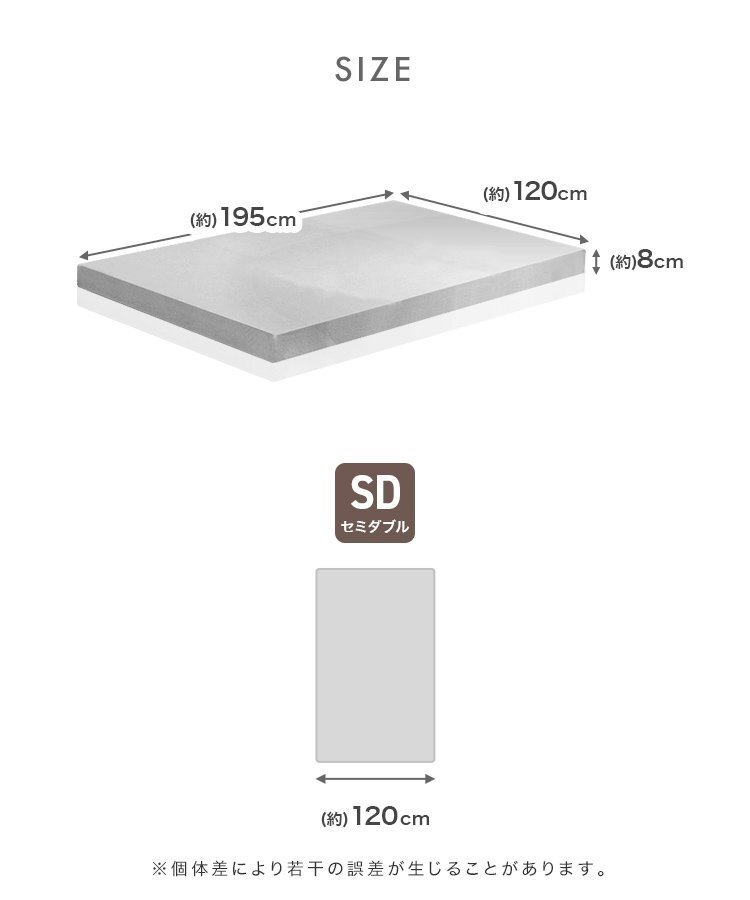 | 一枚取り入れるだけで、じんわりやわらかな夢の寝心地を実現する低反発マットレスです♪ 厚みが8cmあるので、そのまま敷いてもOK!マットレスや敷き布団の上に敷けばOK! 底付き感がなく快適におやすみいただけます。 取り外しやすいL字ファスナー付き洗えるカバーが付属しています! 【商品仕様】 カラー:ブラウン サイズ(約):幅120cm×長さ195cm×厚み8cm(セミダブルサイズ) 梱包サイズ(約):53×34×34cm 重量(約):7.5kg 素材:低反発ウレタン(密度40kg/m3)、パイル生地 他 ■注意事項 ・耐熱仕様ではございませんので、電気毛布との併用はおやめください。 ・圧縮梱包されたままの状態で長期間保管した場合、マットレスが復元できなくなってしまいます。商品到着後、すぐ圧縮から開放をして頂くようにお願いいたします。 ・マットレスは約1-2日で復元します。気温や温度により3-14日かかる場合もあります。 ・製品の臭いが気になりましたら、風通しの良いところで脱臭してください。この臭いは素材のウレタンによるもので無害です。臭いに敏感な方は十分ご検討の上、ご購入をお願いいたします。 ・マットの硬さは温度によって変わってきます。また、硬さの感じ方には個人差があります。 ・カバーは取り外して洗濯ができますが、マットレス本体は洗濯しないでください。 ・商品は、モニターによって色合いが異なって見える場合があります。 ・仕様・デザインは改良のため予告なく変更することがあります。 ■保証期間 7日間 ※商品到着後7日以内の初期不良・破損のみご対応させていただきます。 【新品未使用品です】 |