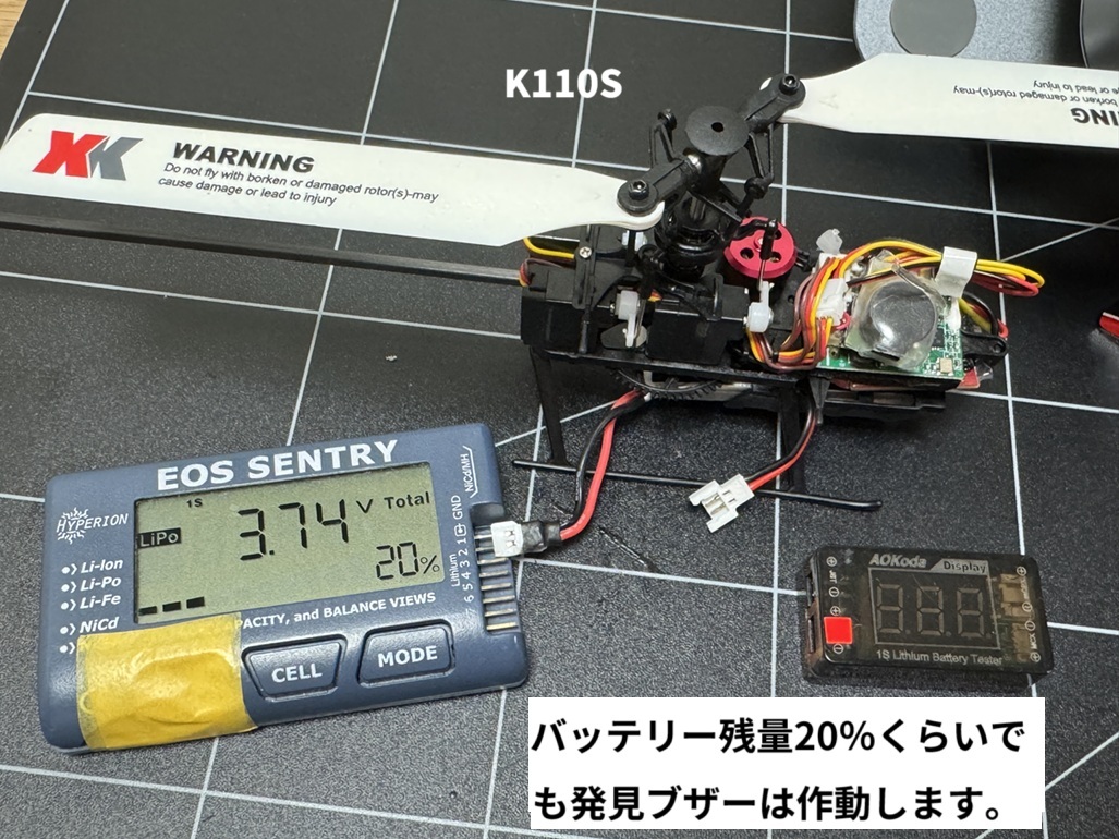 (注意)たまにエラーによってブザーが鳴ったりする場合もあるかもしれませんが、接続するサーボによりますが、エルロンやエレベーターサーボを動かせば鳴り止みます。3Dフライト途中にエラーが出てブザーが鳴るということはほぼありません。また機体のバッテリー電圧が低くなりすぎるとならない場合があります。品質性能が良いと記述いたしましたが、3年前まで販売した1500個の発見ブザーで、ブザーが鳴らないというエラーが出ていないということです。機体にバッテリーを接続した時に必ずブザーが2回鳴ります。これが発見ブザーが正常に作動している証になります。K110ヘリなどで1セルバッテリーの電圧が低くなりすぎるとブザーにエラーが出ます。