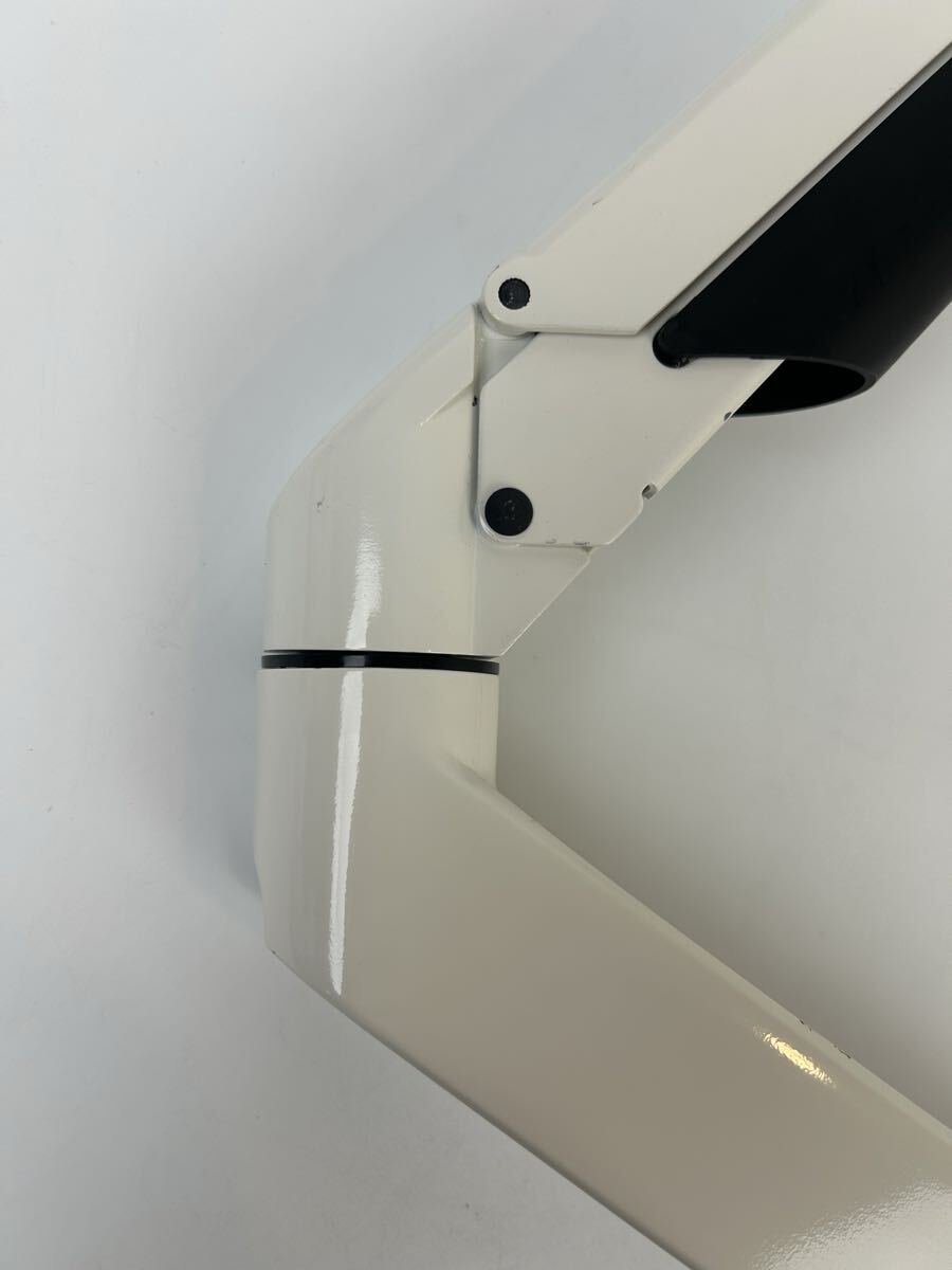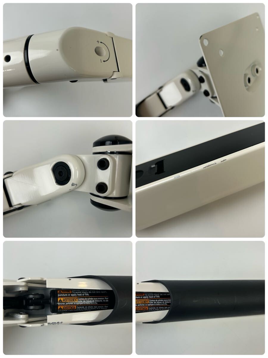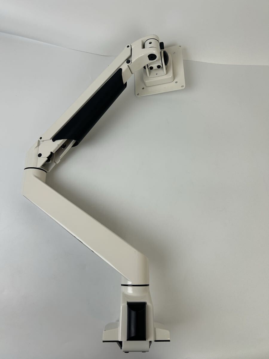 水平アームとガスシリンダーを内蔵した垂直アームを組み合わせたモニターアームです。デスクへの取り付けはクランプ式で、板厚1050mmのデスクに対応します。