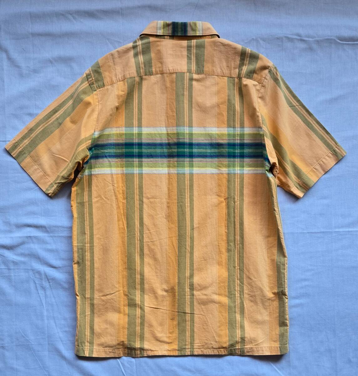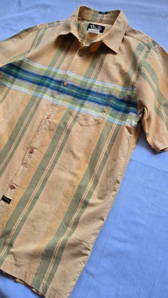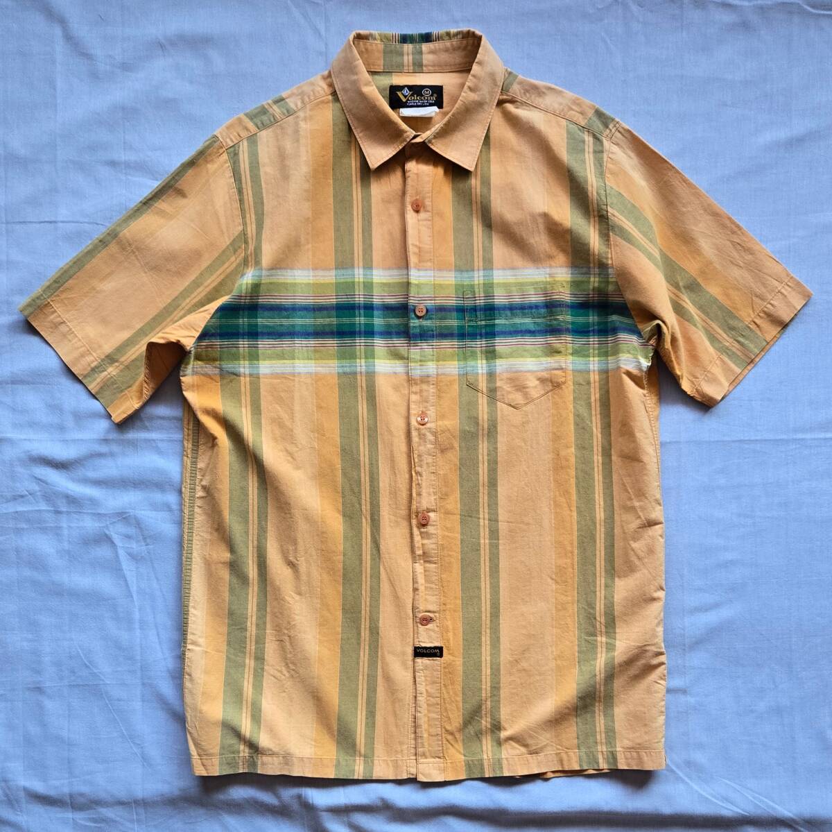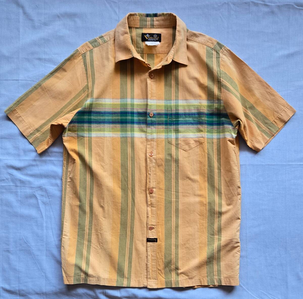 送料無料 VOLCOM ボルコム ビンテージ オレンジ グリーン ランダム チェック ボーダー ストライプ ワークシャツ ロゴ タグ 半袖 シャツ