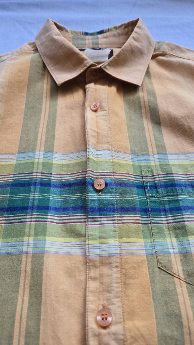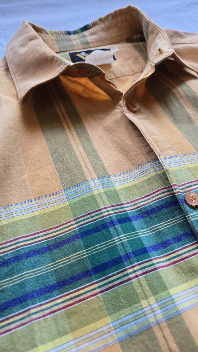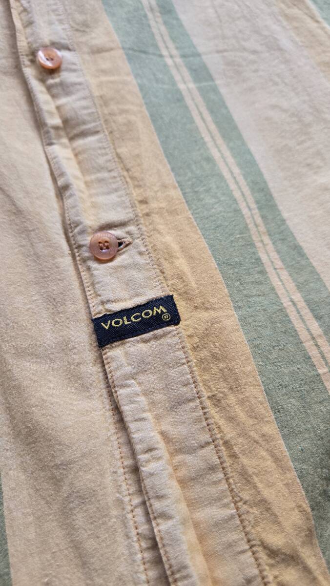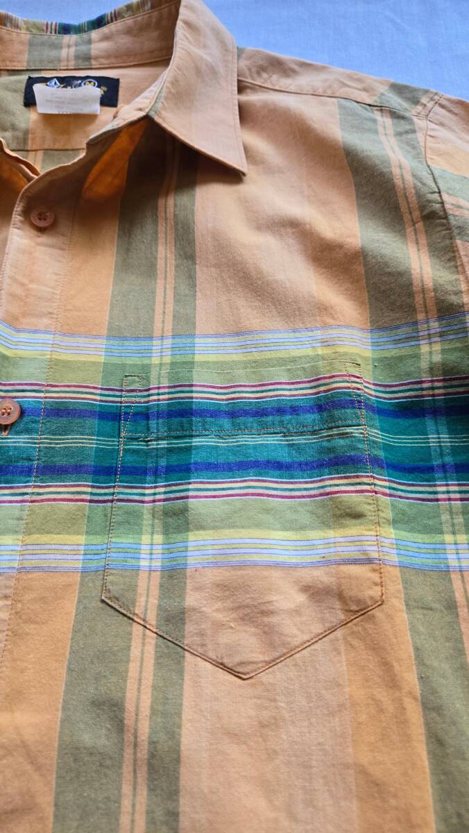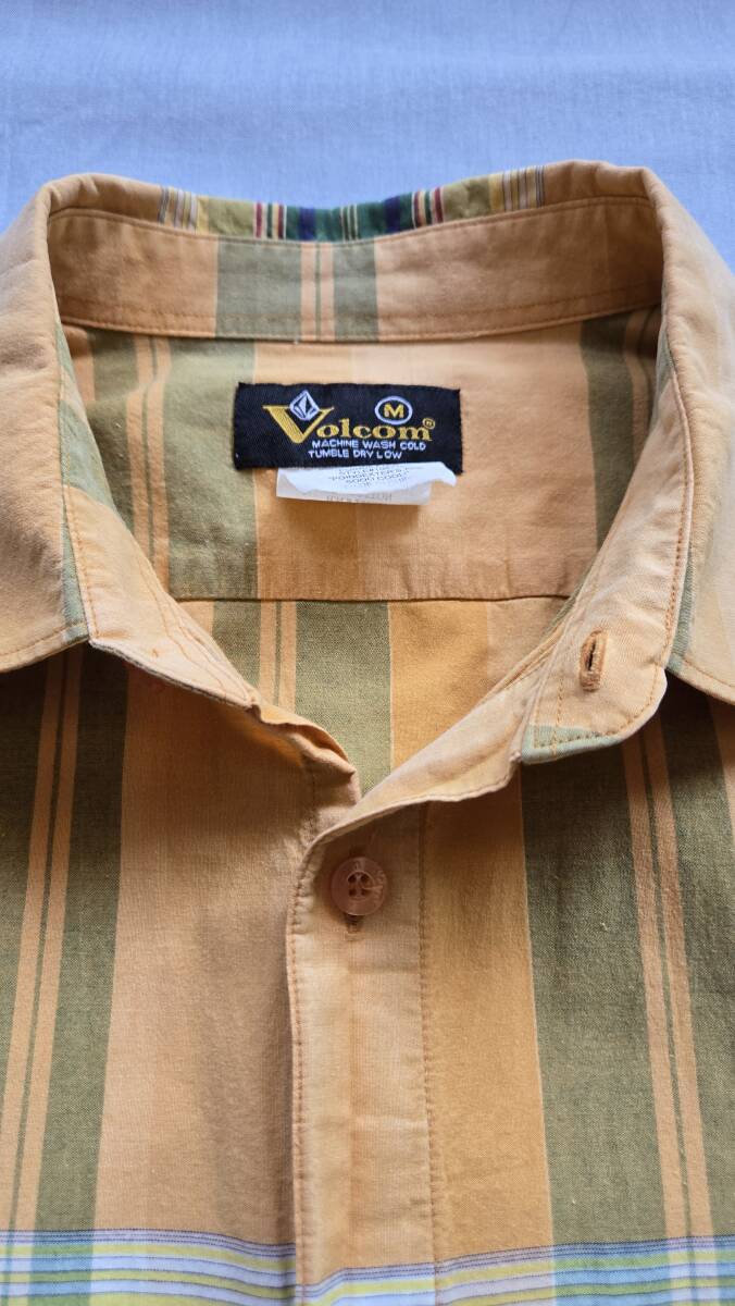 送料無料 VOLCOM ボルコム ビンテージ オレンジ グリーン ランダム チェック ボーダー ストライプ ワークシャツ ロゴ タグ 半袖 シャツ