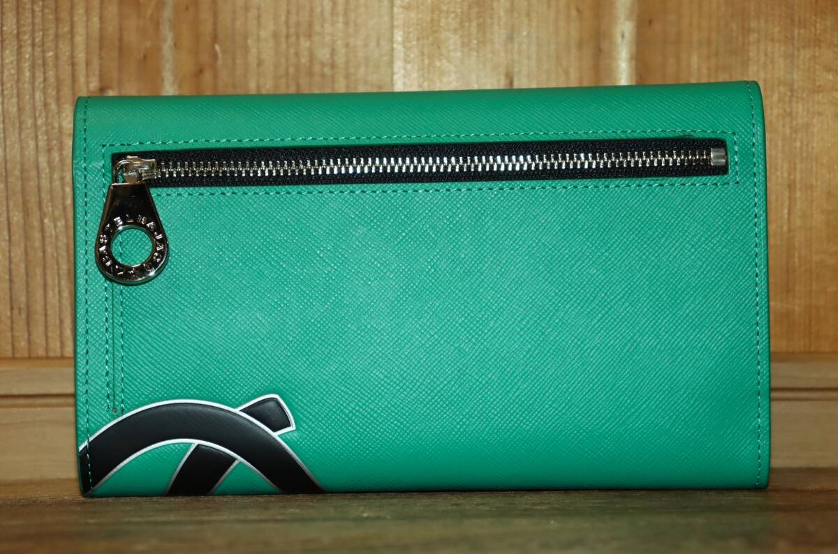 枠からはみ出たようなブランド家紋デザインが特徴の長財布。