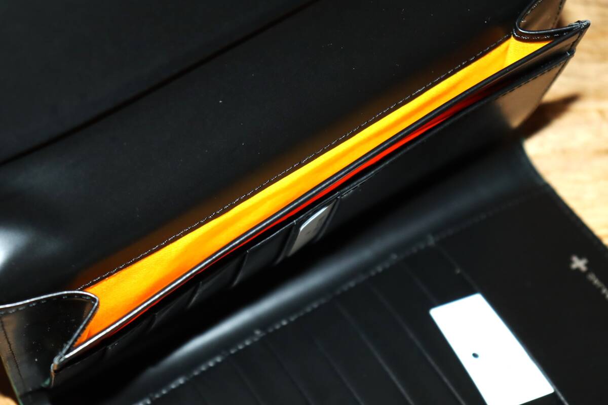 かぶせタイプの長財布を開くと、札入れが1つ、カード段が16、ポケット大が2つあります。