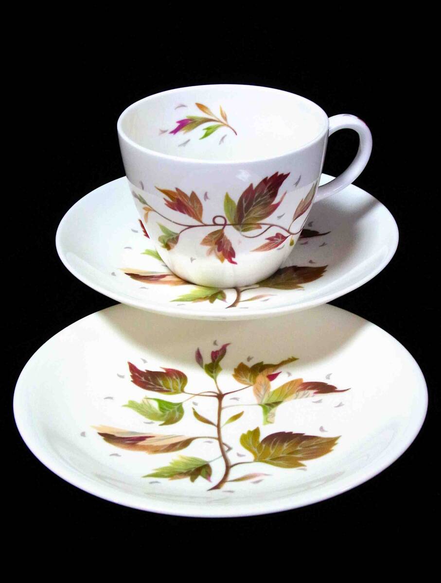 彼は同じモチーフで、タプリンと会話をするように彼女と共通テーマで別パターンのカップとウェアを次々と作っていった。一方でピーター・ウォールとタプリンの組み合わせで同じような「社内競作」で多種のパターンを作らせた。その中で、「落ち葉」をテーマに与えてタプリンが考えたのが「落ち葉」。ピーターが作ったのが「ウエイクフィールド」。出品者は熱心な作品探索と得意の妄想力を駆使して、こういう結論を導き出しました。いちいちカップを取り寄せて出品しながら推論を積み重ねてきましたから。結構力を入れてきましたから。努力を認めてほしい。