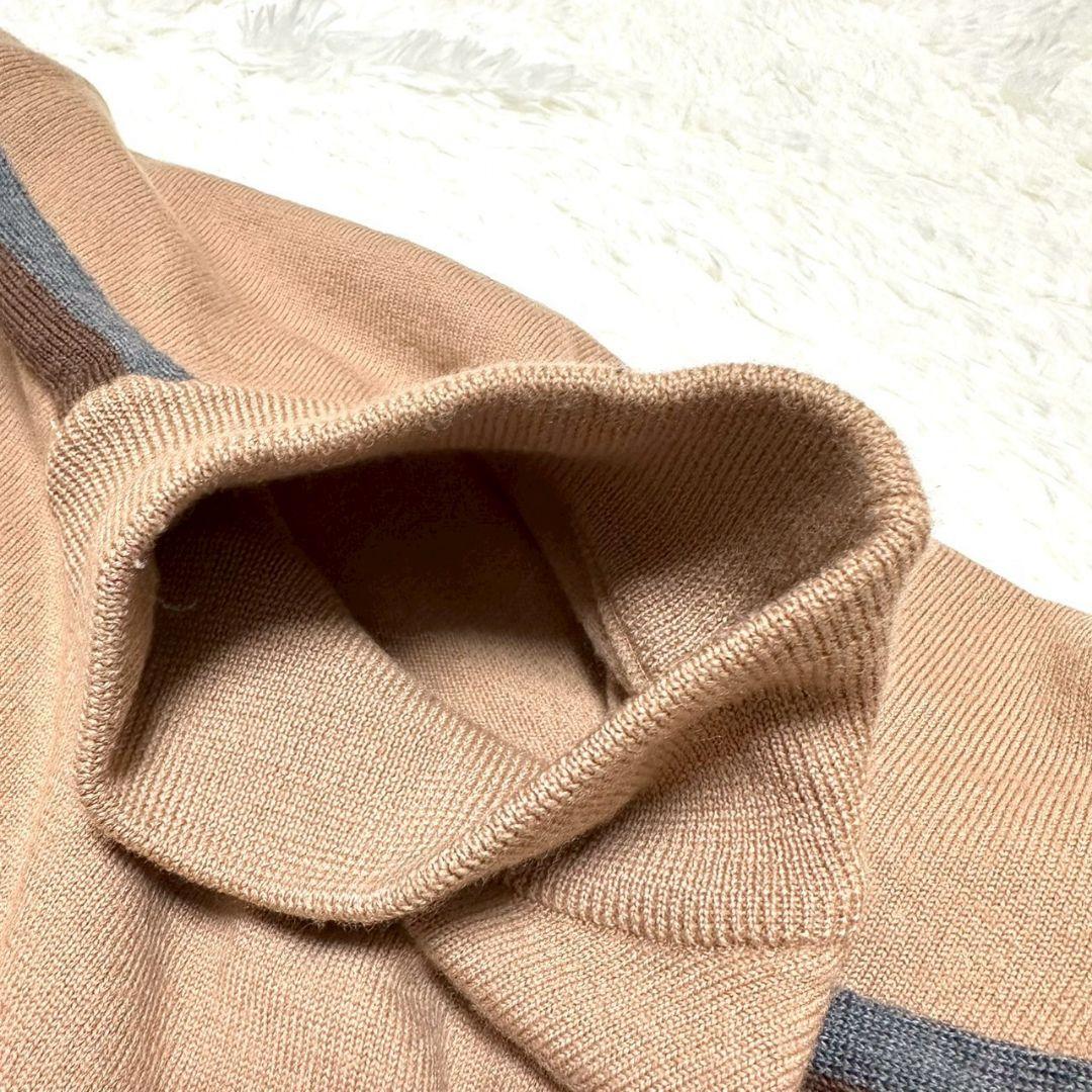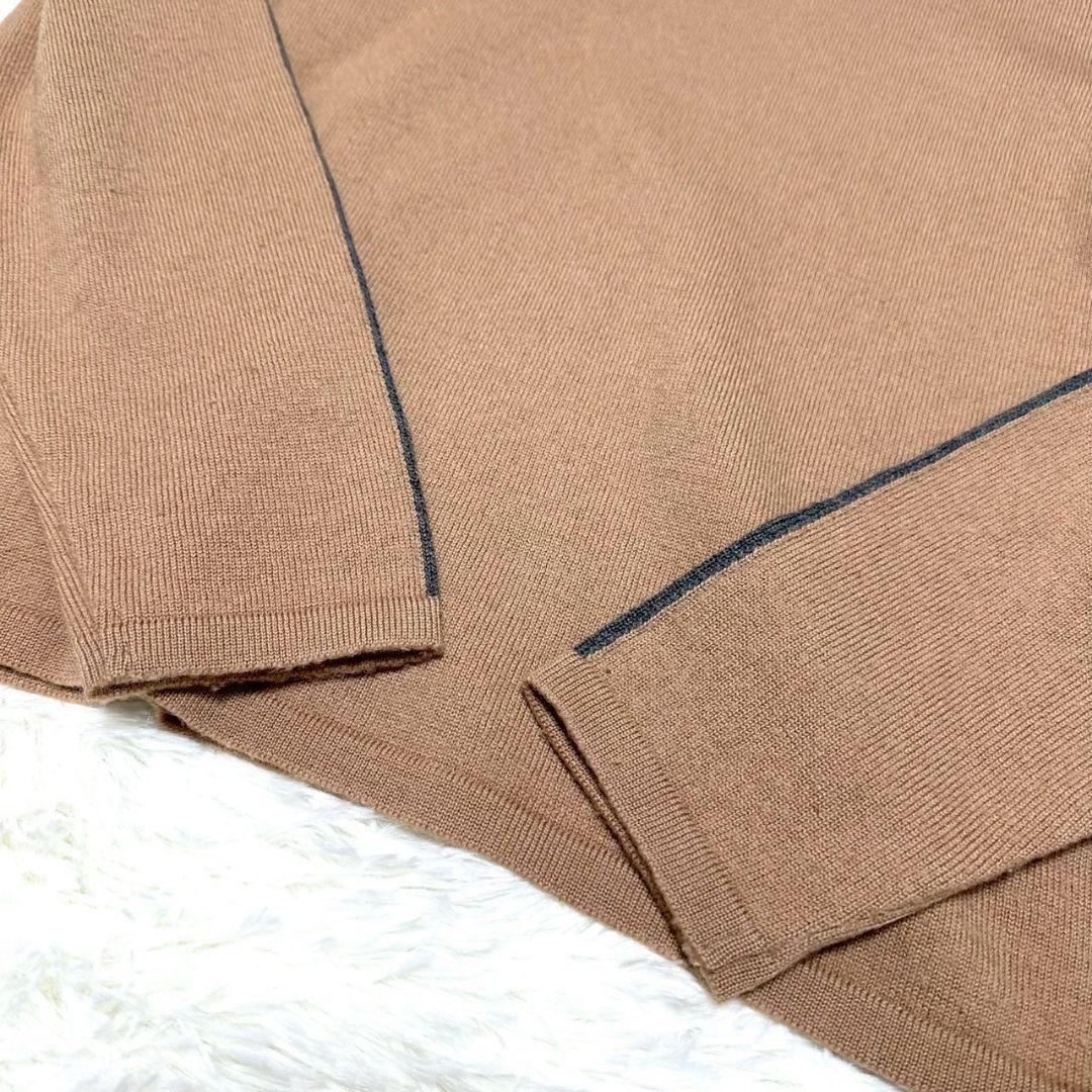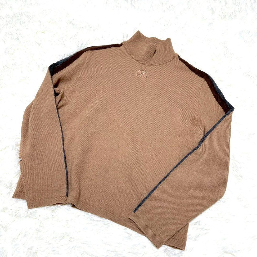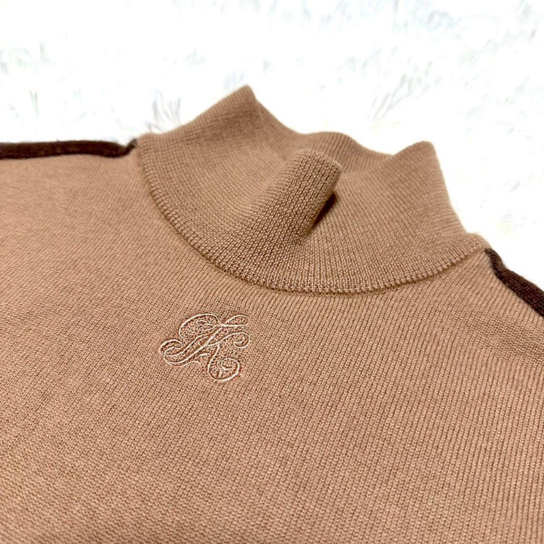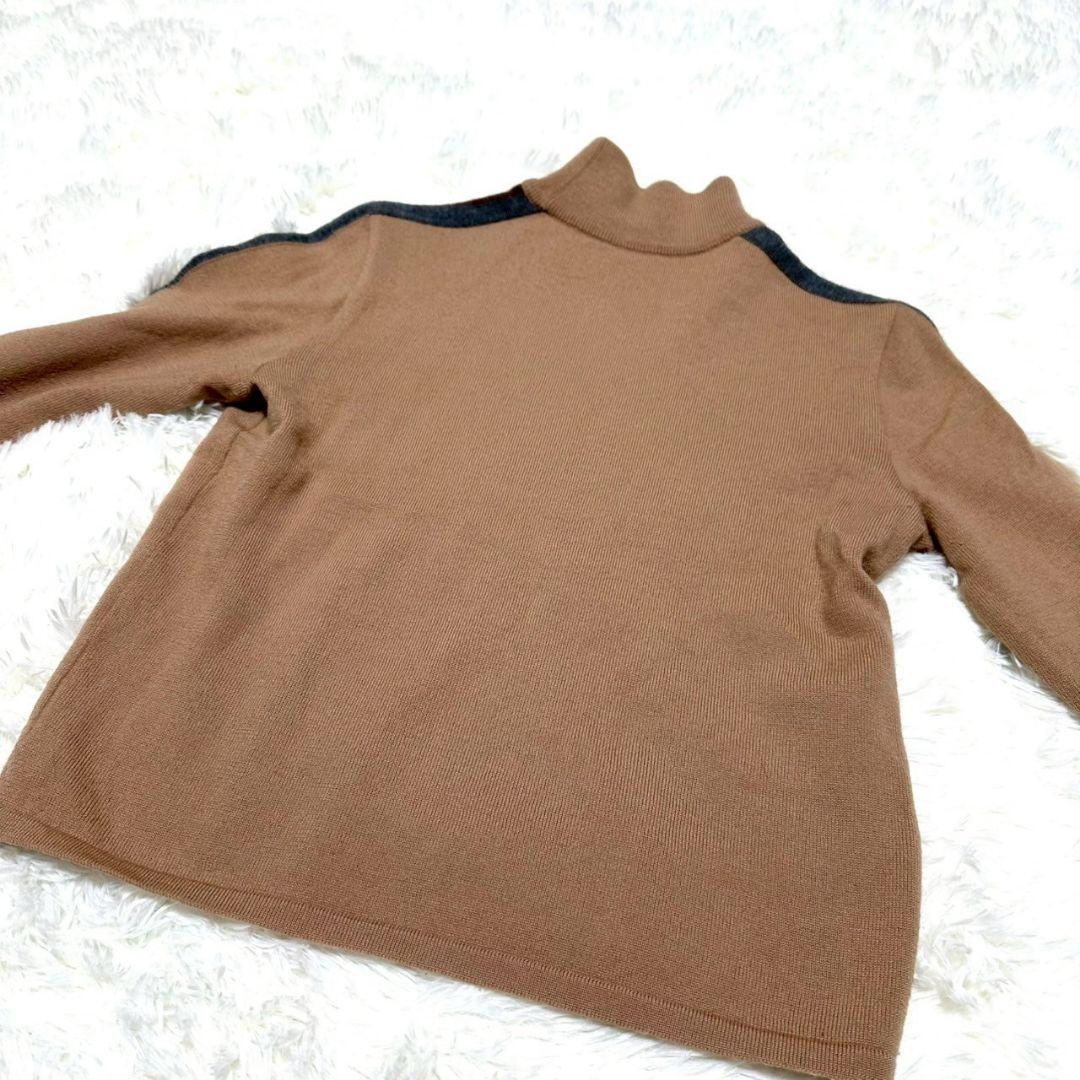 ブラウンのタートルネックニット、サイドに黒のラインが特徴。