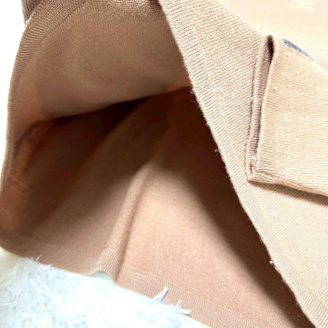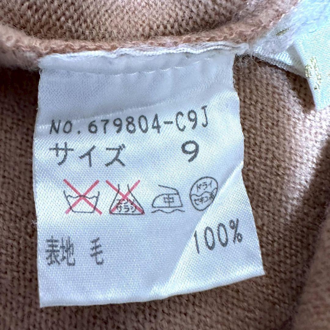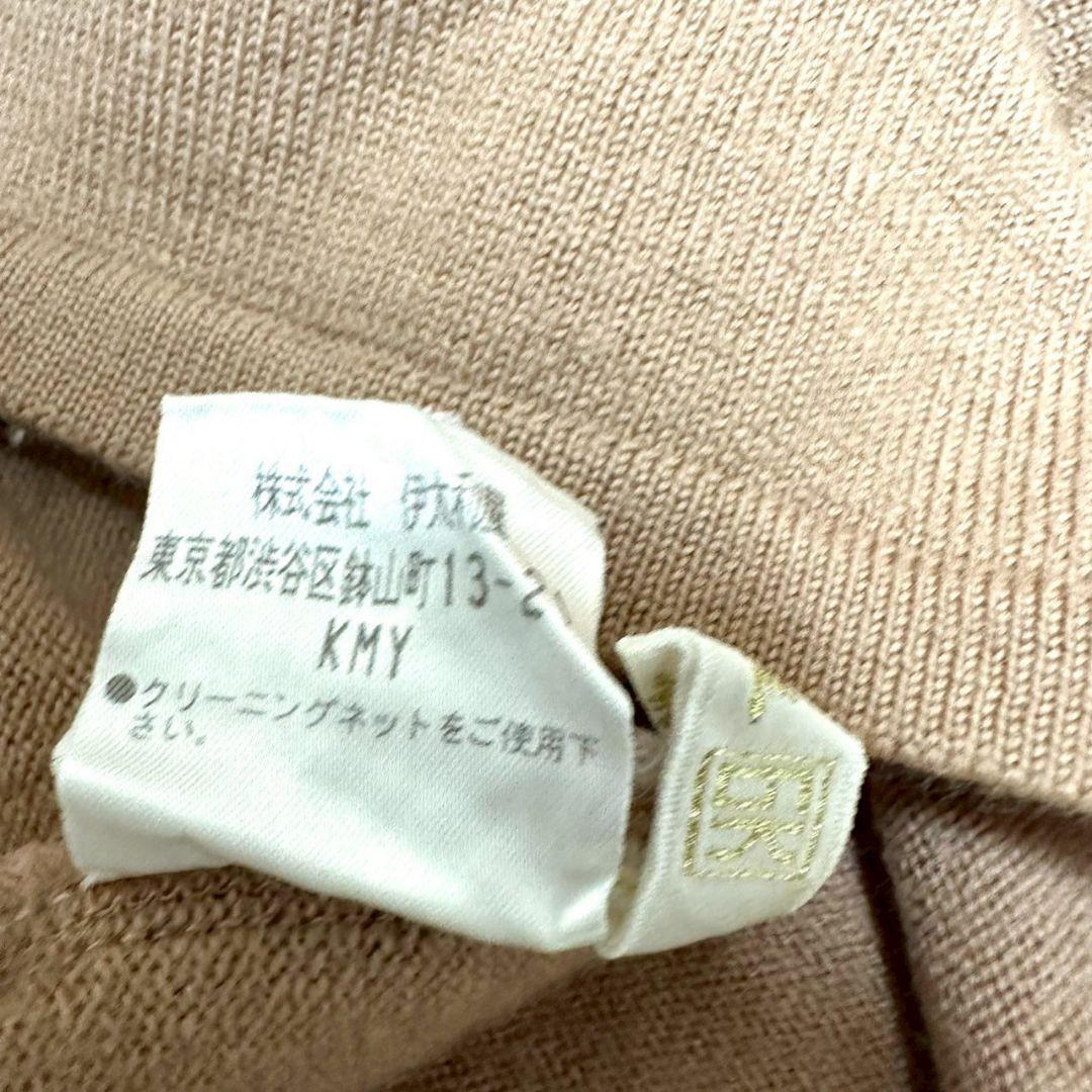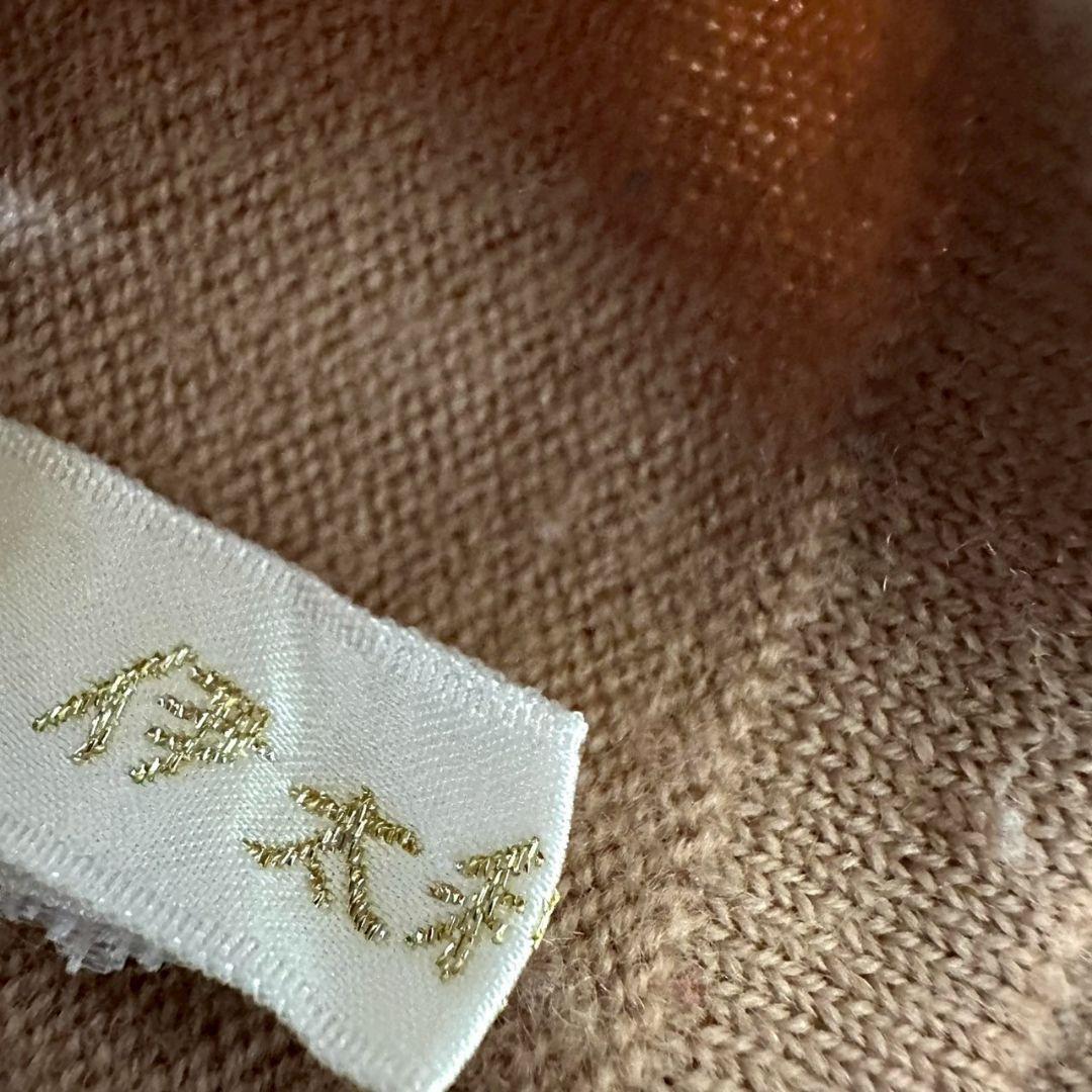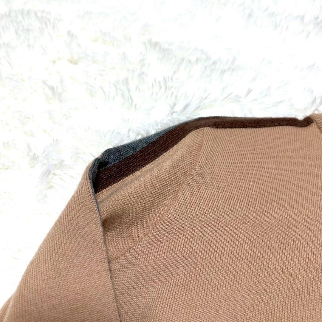 ブラウンのタートルネックニット、サイドに黒のラインが特徴。
