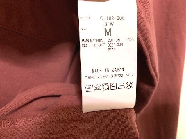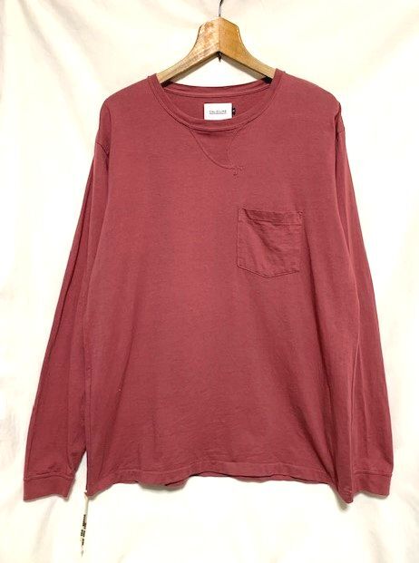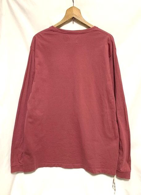 赤と茶の間くらいのチェリーブラウンカラーの製品染めが施されたクルーネックのロングスリーブTシャツです。左胸にはポケット、首元は通常のガゼットをサーフィンボードのフィンの形にしたガゼットになっています。右サイド裾にはレザー紐とビーズがワンポイントで付いています。生地もやや厚みのあるスラブコットン生地で、製品染めが使っていくことで独特の色落ちをしますので、退色の風合いを楽しんで使っていただけます。これからのシーズンに単体でもインナーとしても使いやすいアイテムですし、綺麗な状態で出品させていただきますので、是非、ご活用いただけたらと思います。