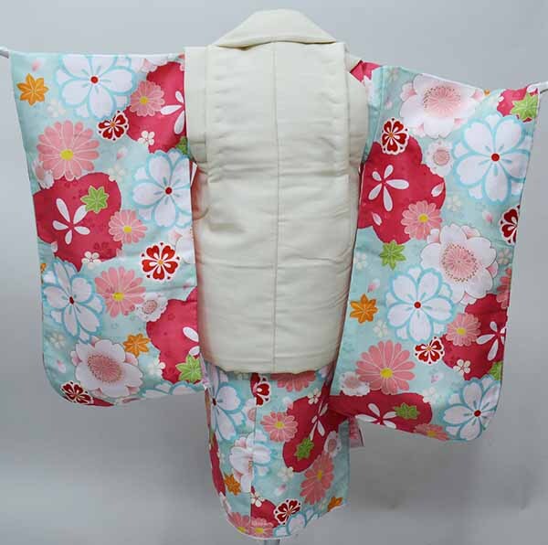 | 品質 | 仕立て上がり(すぐ着用できます。) ★華やかで鮮やかな色合いの祝い着です ★被布には美しい刺繍入り ★「伊達襟」が縫い付け済みです ★草履は鼻緒に可愛い小花の刺繍入りです ※表地、裏地、襦袢すべてポリエステル100% ※当店では、現物と写真画像の色、イメージに相違がないよう撮影に工夫を凝らしておりますが、 より詳しいお色説明をご希望のお客様は「サイト設置の質問」「メール(aji_net@khaki.plala.or.jp)」「お電話」「FAX」にて、御質問ください。 |
