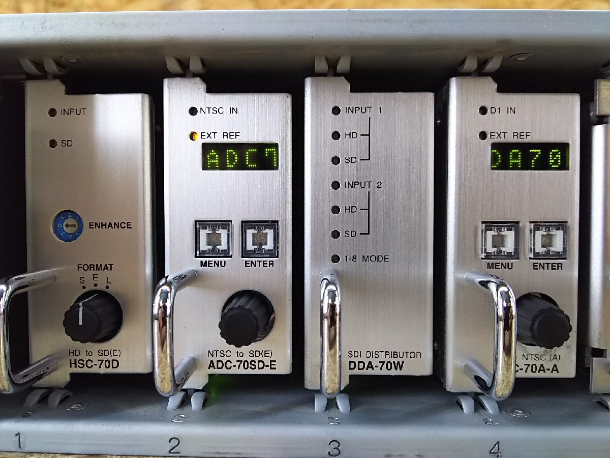 VIDEOTRON Vbus-70B 70シリーズ筐体 モジュール切換器 ーーーーーーーーーーーーーーーーーーーーーーーーーーーーーーー ●メーカー:VIDEOTRON ●型 番:Vbus-70B ●品 名:70形筐体 モジュール切換器 ●内蔵ユニット:HSC-70D・ADC-70SD-E・DDA-70W・DAC-70A-A ーーーーーーーーーーーーーーーーーーーーーーーーーーーーーーー ●2箇所の電源の通電確認済みです。4枚のモジュールが入ってます。 ●全部のSDI-IN→SDI-OUTに繋ぎ映像が出る事だけ確認しました。 ●専門的な商品のため、その他の詳細な動作確認は行っておりません。 アフターサポートもできませんのでご了承ください。 ●ブランクボードが6箇所装填されています。 ◎付属品 本体のみ ◎外観 本商品は中古品です。経年・使用に伴う擦り傷/汚れがあります。 外観等を著しく気になさる方や新品に近い美品をご希望の方はご遠慮ください。 筐体に傷がございます。 ●専門的な商品の為、使い方や設定等のご質問にはお答えできません。ご了承ください。 ●詳しい仕様等、商品についてはメーカーサイトなどをご参照ください ●現状品の為、保証や返品は対象外です。お届け後、使用できなかったとしても返品はお受けできません。 ※保証期間内であっても,水没・落下などお客様が原因で起こった不具合は保証対象外です ※ハードウェア、ソフトウェアに関するサポートは行ってません 以上をご理解頂ける方のみ、ご入札をお願い致します