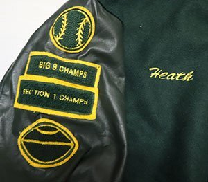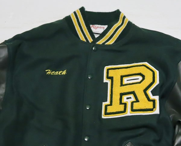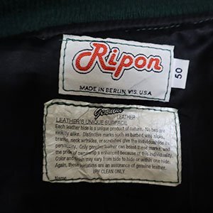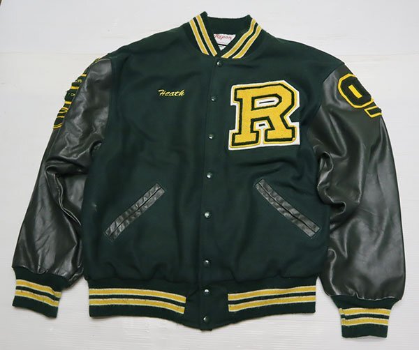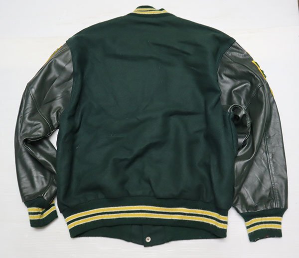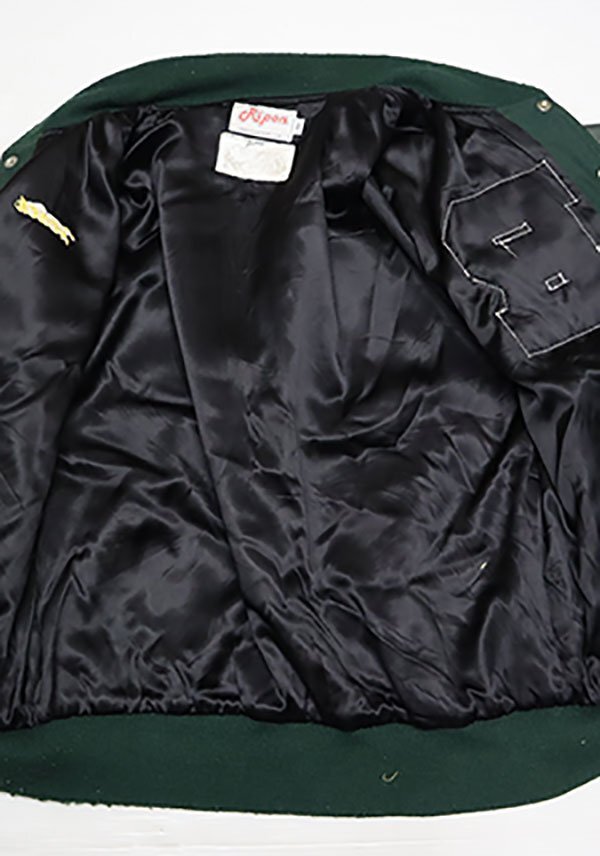 アメリカ買い付けのアメリカ製の袖Xポケット縁革スタジャンの緑系の裏地内装はアセテート?です。