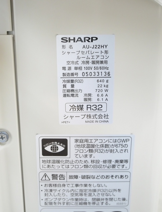 【未使用品】【室外機のみ】シャープ製/ルームエアコン/6畳用/AU-J22HY(7090676)