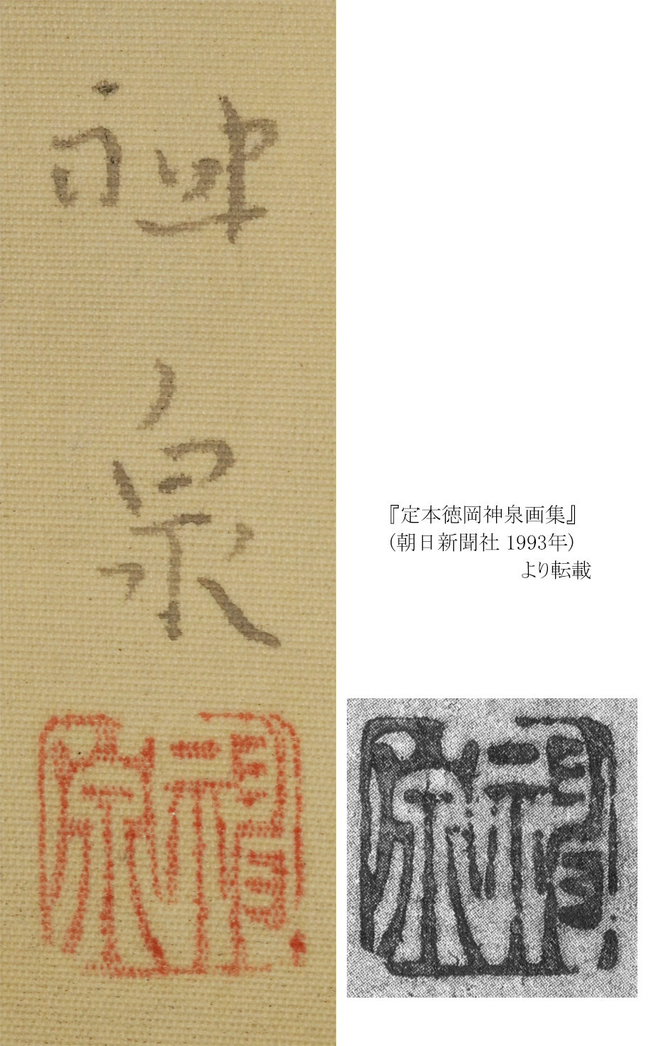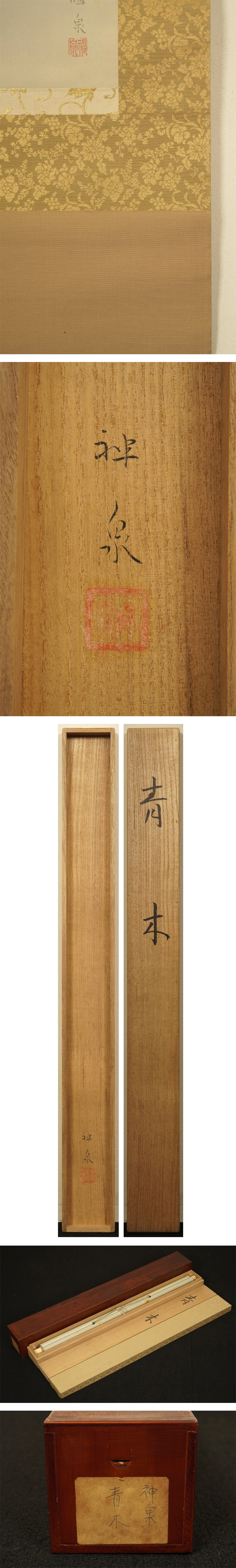 総丈サイズ…横 66 × 縦 142.5 cm 絹本着色金銀泥・共箱 二重箱入 状態…本紙微少シミ・微少オレ 【印刷ではありません】 【真作】 徳岡神泉 大正~昭和の日本画家。京都生。本名時次郎。竹内栖鳳に師事。京都市立美術工芸学校卒・京都市立絵画専門学校修了。官展で落選を重ね一時京都を離れるが、帰郷後は入選を重ね、「神泉様式」とも言える独自の画風を確立した。芸術院会員。帝展審査員。文化功労者。文化勲章受章。昭和47年(1972)歿、76歳。 |