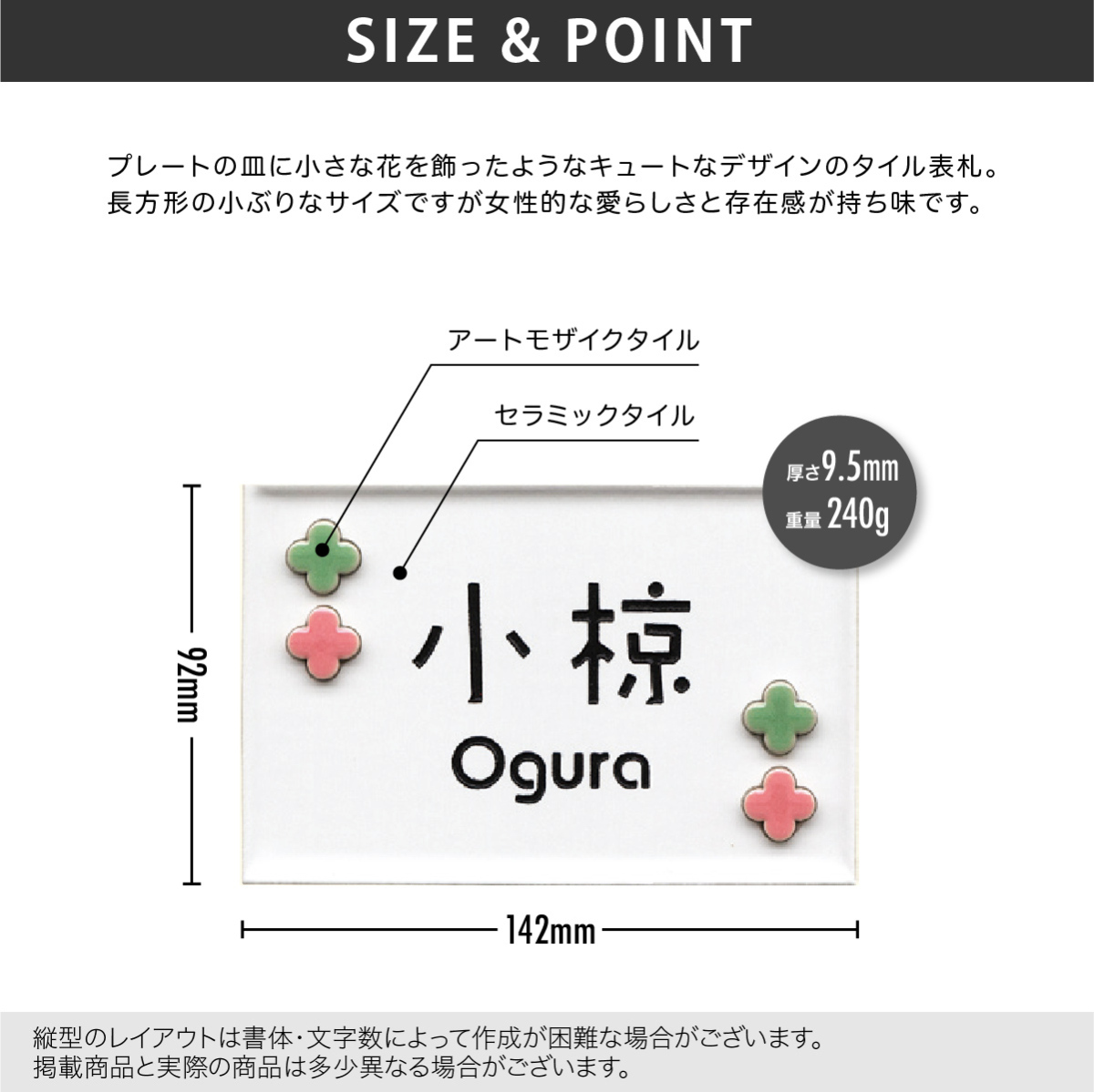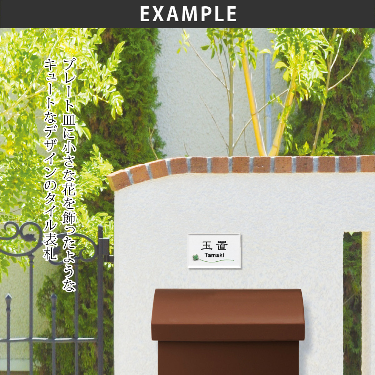 | 商品詳細 | プレート皿に小さな花を飾ったようなキュートなデザインのタイル表札。長方形の小ぶりなサイズですが、女性的な愛らしさと存在感が持ち味です。 |