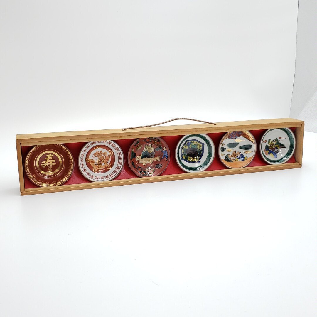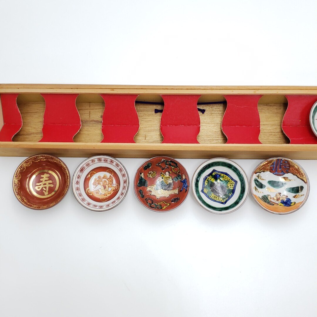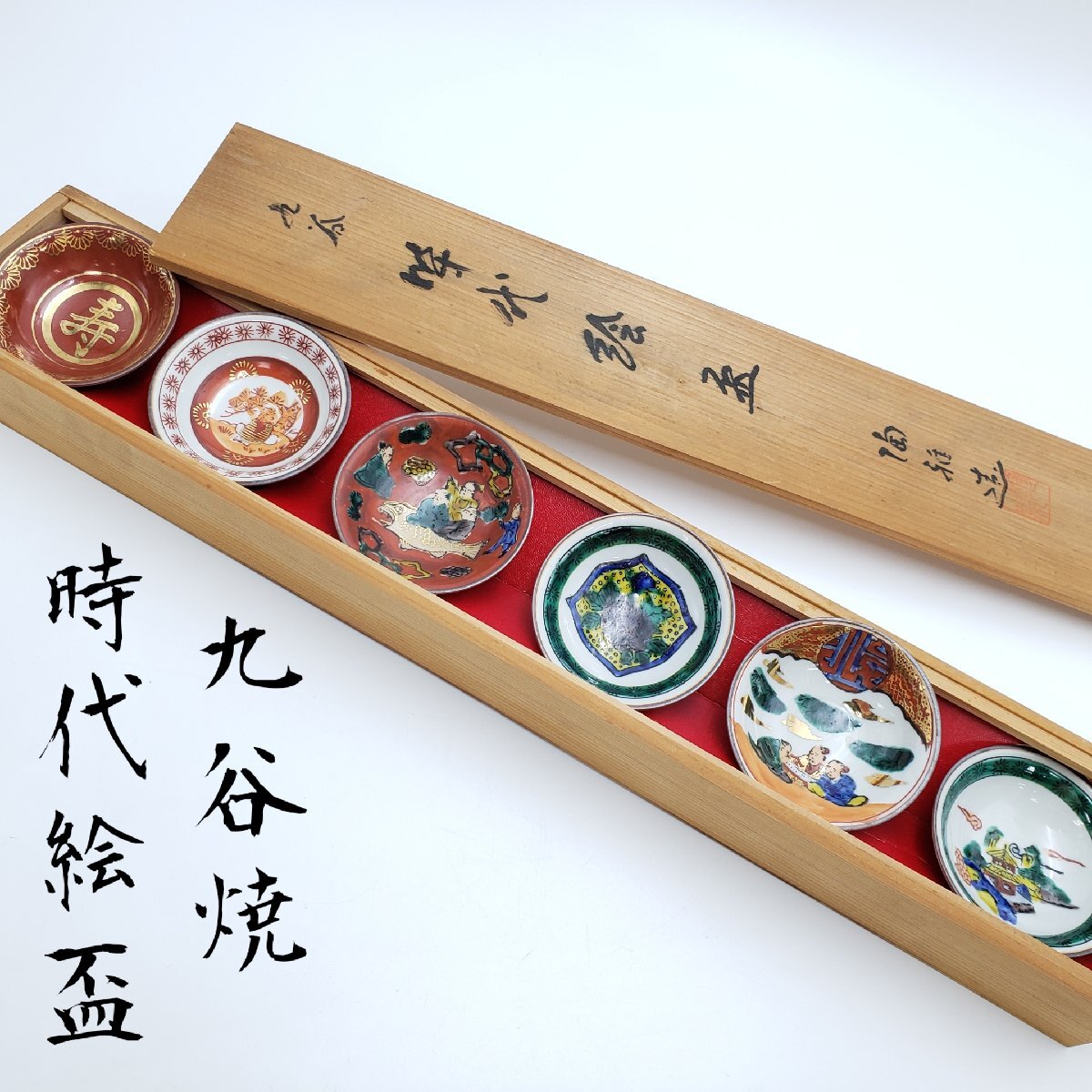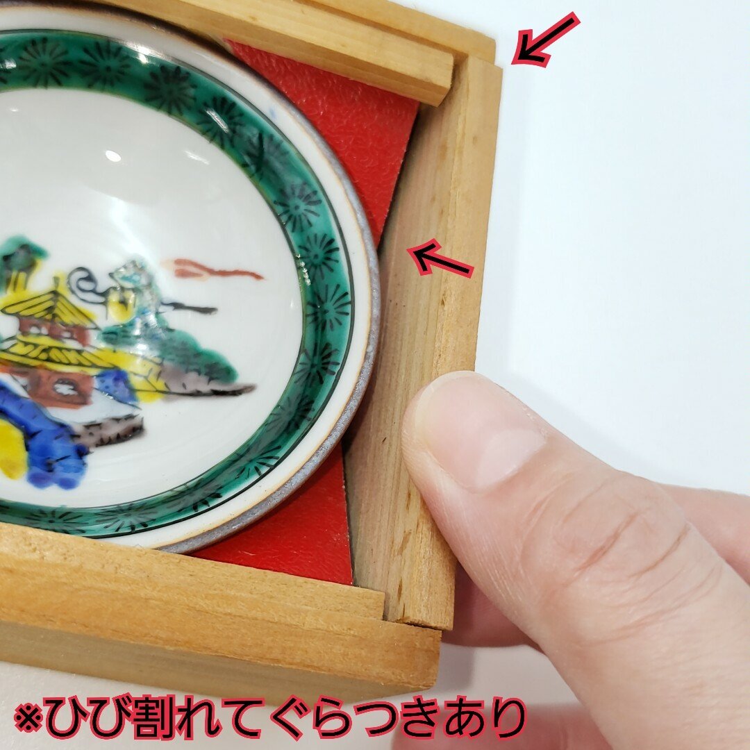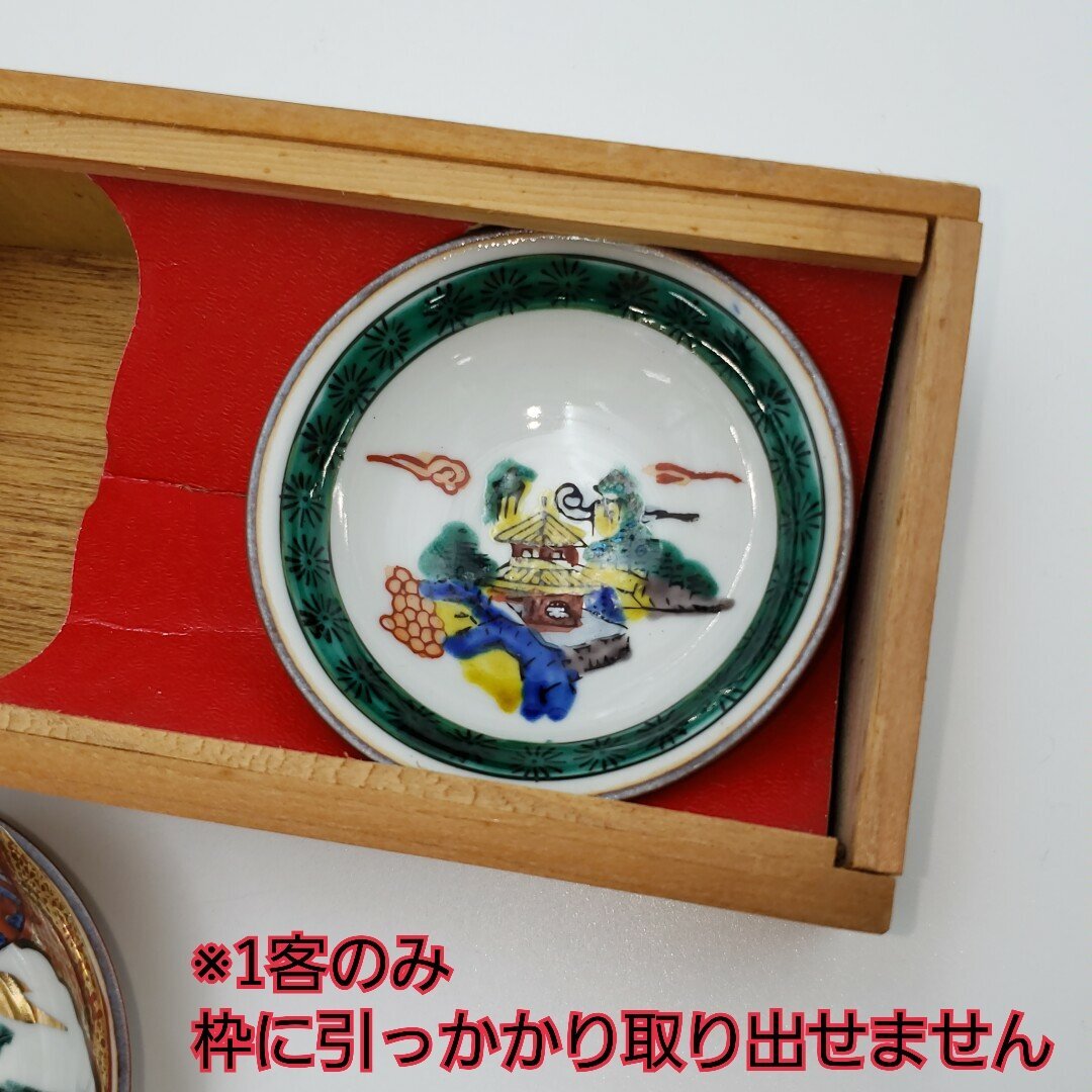九谷焼の時代盃6客セットです。経年による汚れ、擦れがあります。1客が木箱の枠に引っ掛かり取り出せません。木箱の横側がヒビ割れてぐらつきがみられます。