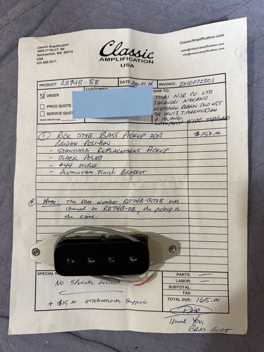 Rickenbacker リッケンバッカー リア ピックアップ Classic Amplification USA カスタムメイド 中古