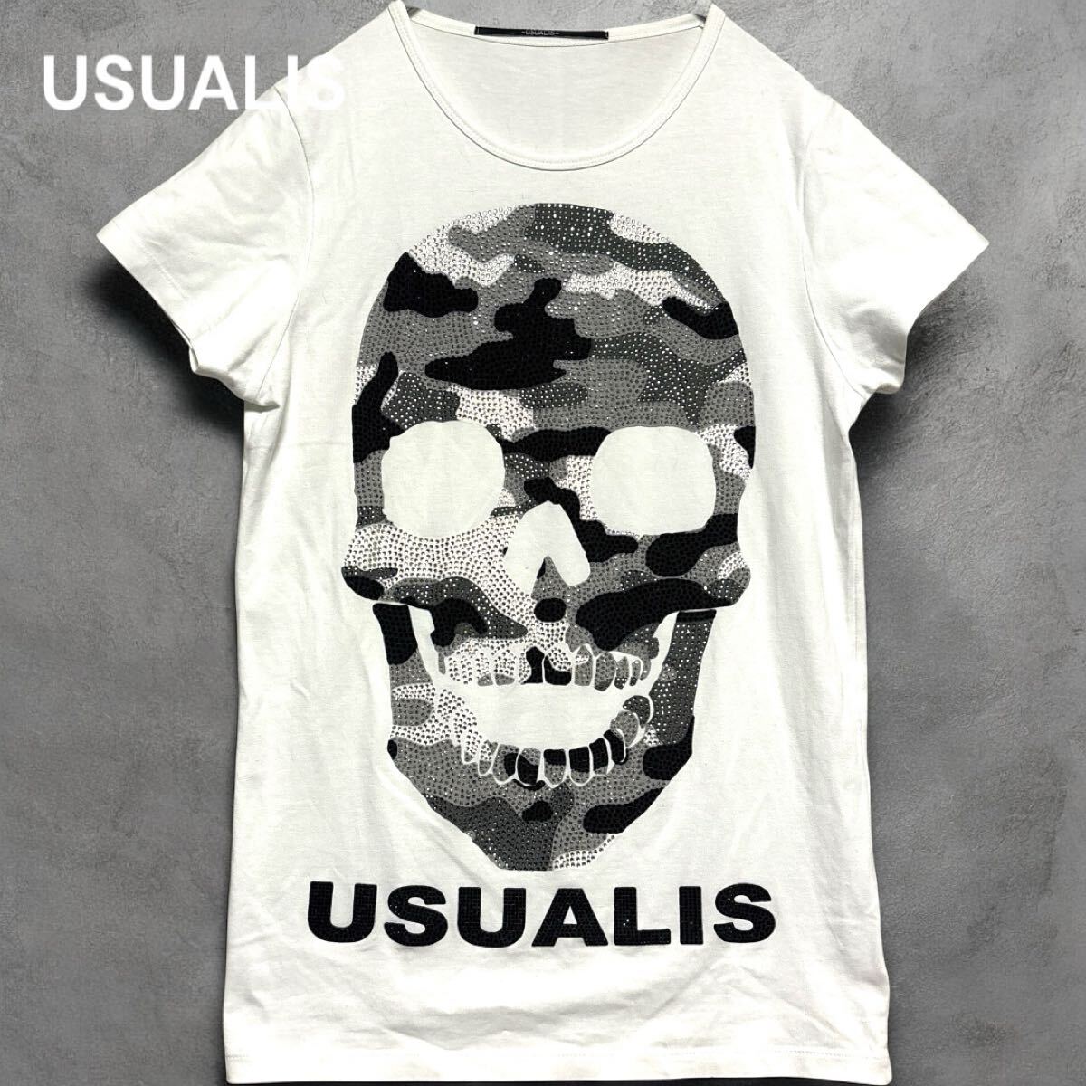 フロントに大きくプリントされたスカルデザインが目を引く、USUALISの人気Tシャツです。カモフラ柄とキラキララインストーン
