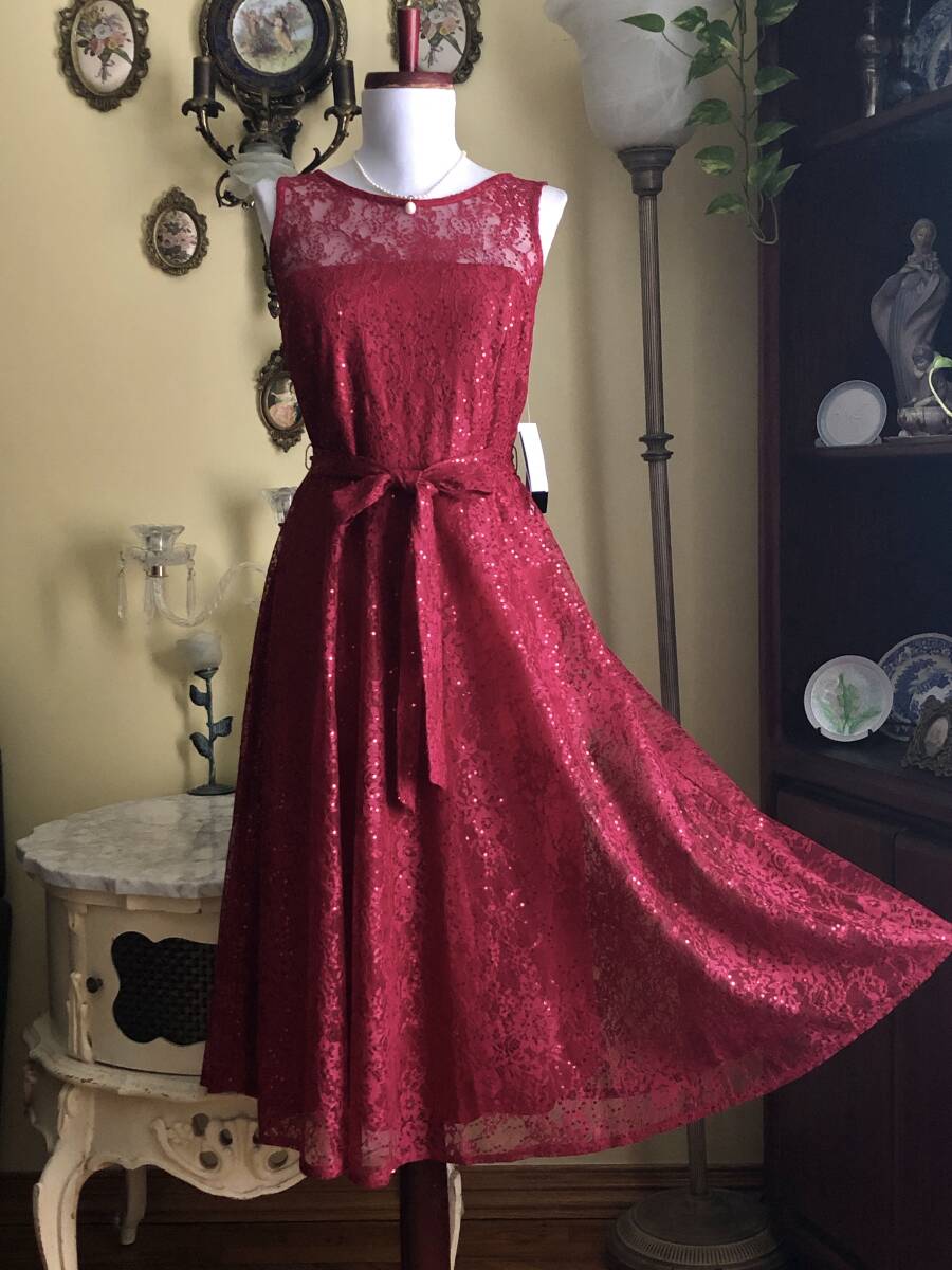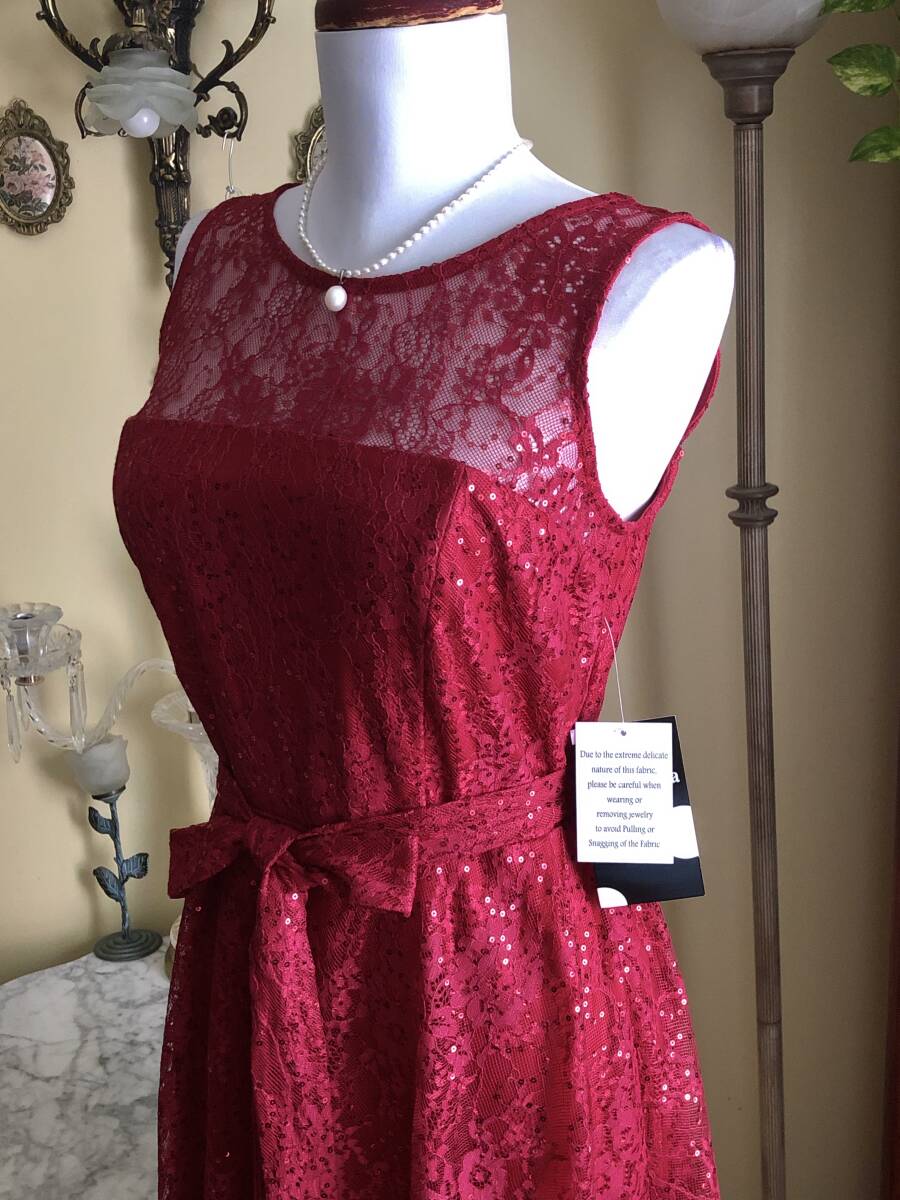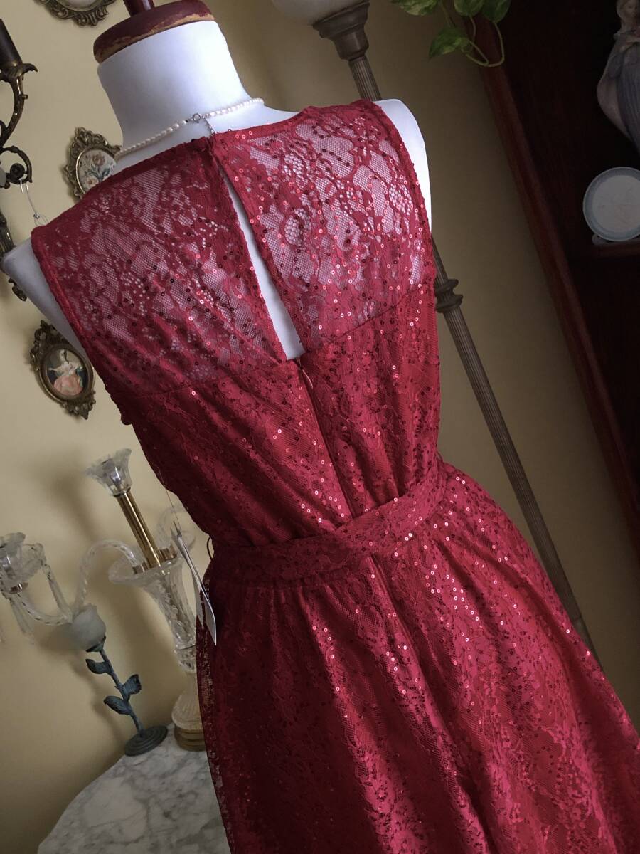 【MAISON TARA】より、素敵なレースのカクテルドレスです。 深紅色のレースが綺麗です。 小さなスパンコールが優しく輝いて素敵です。 Aラインのフレアースカートです。 後ウエストにゴムが入っています。 リボンベルトでウエストサイズの調節ができます。 スムース素材の裏地が付いています。 後ネックカギホック、後ファスナーで開きます。 【状態】新品 【ブランド】MAISON TARA 【サイズ】表示サイズ/US(アメリカ)6 日本対応サイズ目安/ 11号サイズぐらい *個人差がございます。必ず採寸をご参照ください。 【採寸】平置き採寸です。 肩幅32cm、身幅46cm、ウエスト37㎝~42cm、着丈113cm(上身丈38cm+スカート丈75cm) 【カラー】深紅 【素材】ポリエステル100% 【裏地の素材】ポリエステル100% 【着脱】後カギホック、ファスナー