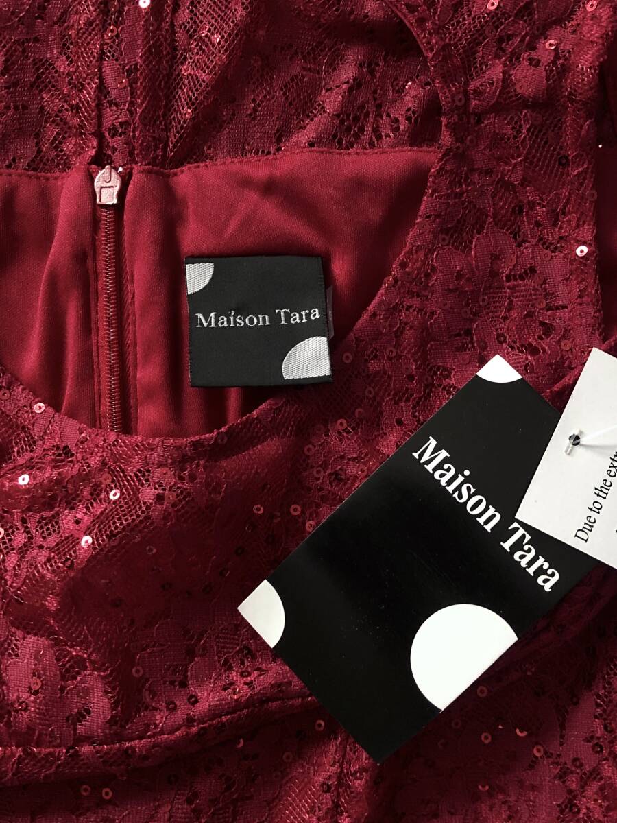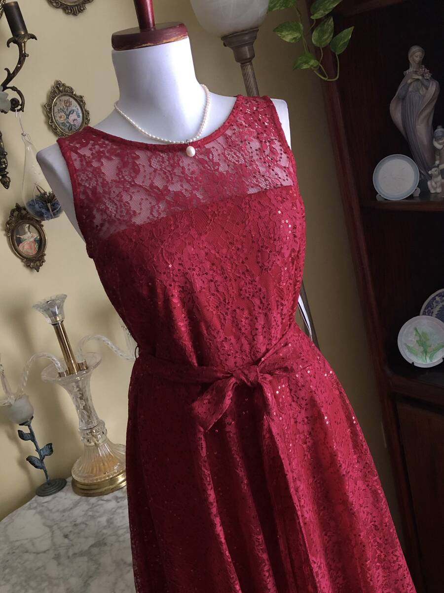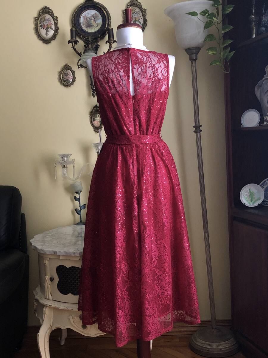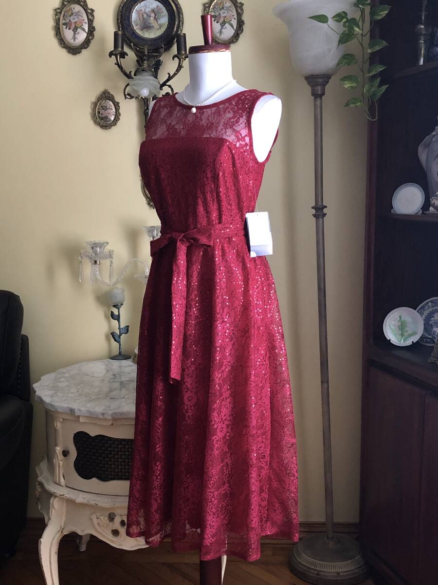 【MAISON TARA】より、素敵なレースのカクテルドレスです。 深紅色のレースが綺麗です。 小さなスパンコールが優しく輝いて素敵です。 Aラインのフレアースカートです。 後ウエストにゴムが入っています。 リボンベルトでウエストサイズの調節ができます。 スムース素材の裏地が付いています。 後ネックカギホック、後ファスナーで開きます。 【状態】新品 【ブランド】MAISON TARA 【サイズ】表示サイズ/US(アメリカ)6 日本対応サイズ目安/ 11号サイズぐらい *個人差がございます。必ず採寸をご参照ください。 【採寸】平置き採寸です。 肩幅32cm、身幅46cm、ウエスト37㎝~42cm、着丈113cm(上身丈38cm+スカート丈75cm) 【カラー】深紅 【素材】ポリエステル100% 【裏地の素材】ポリエステル100% 【着脱】後カギホック、ファスナー