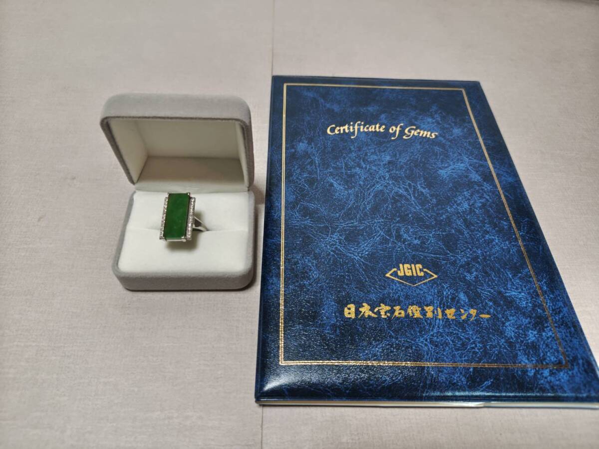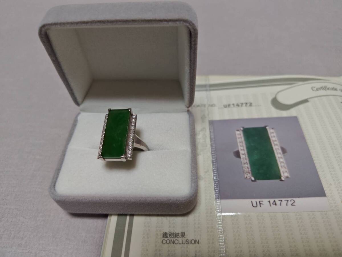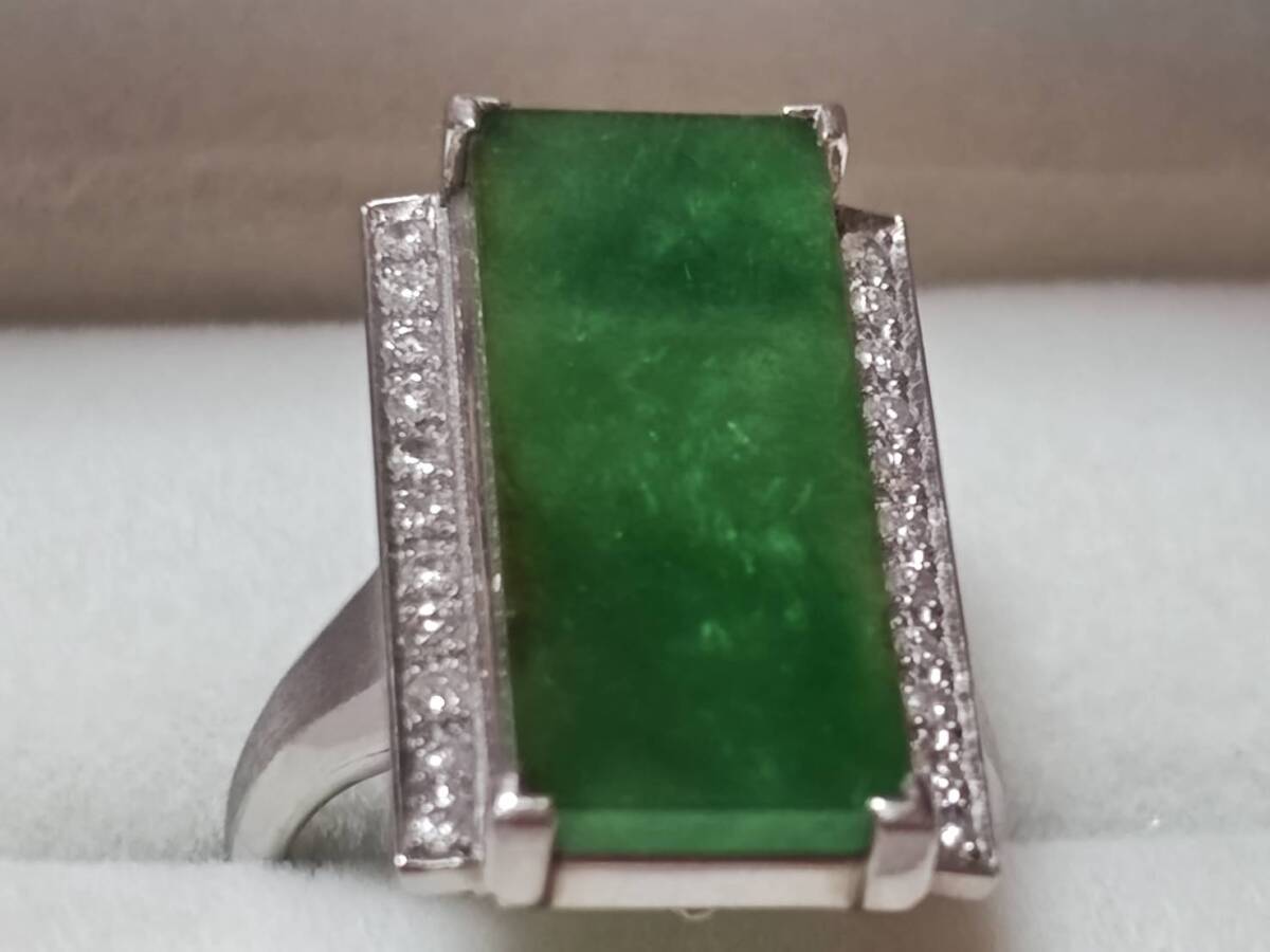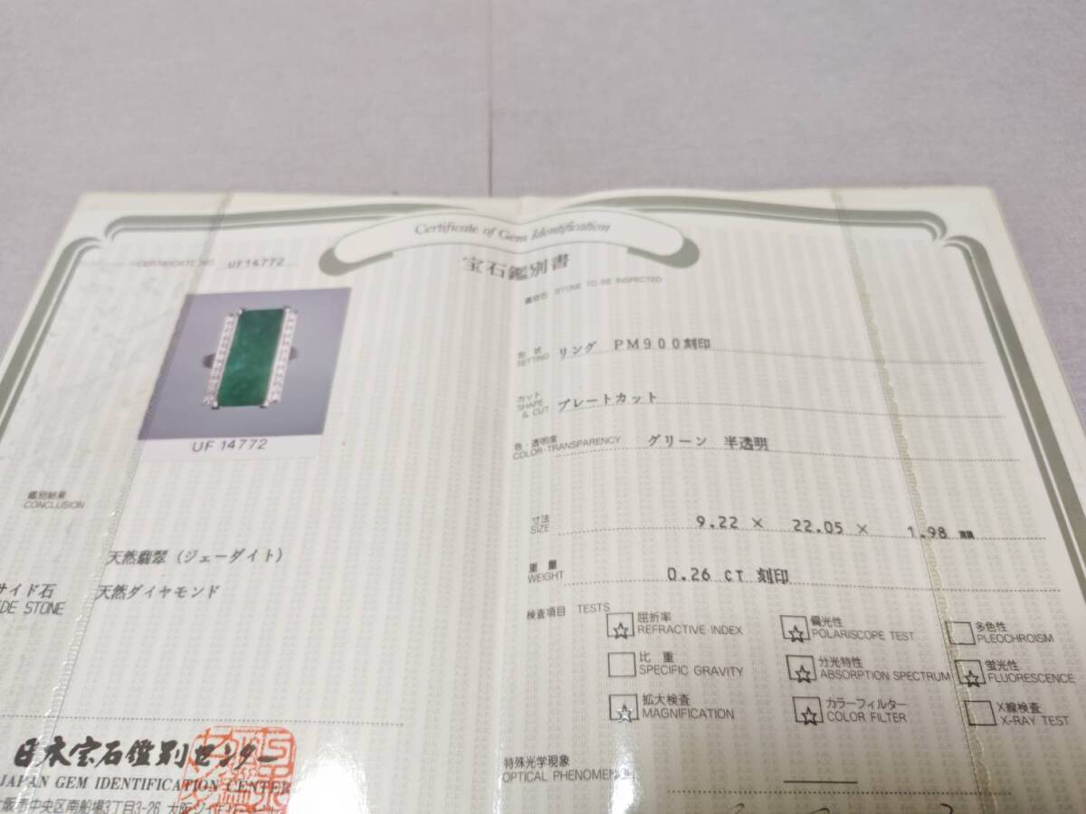 ご縁があり気に入って下さる方がおられましたら♪ 《 天然翡翠 ひすい ~ プラチナ台 プレートカット リング 指輪 》   ☆ 国内正規宝飾店購入品・USED長期保管品(使用頻度少なめ)・状態良好品・宝石鑑別書あり・プレートカット ・サイズ:ヨコ9.22ミリ×タテ22.05ミリ×厚さ1.98ミリ・重量約13g弱  ☆ プラチナ台に22個の天然ダイヤがあしらわれた綺麗な緑色半透明の翡翠リングです。 平成初期ごろに購入したもの(1990年代のためプラチナ表示がPTになる前のPMになっています)で、角型で落ち着いたデザインなので洋装にも和装にもおすすめです。  和のイベントで数回着用後ずっとボックス保管してありました。 お探しの方がおられましたらどうぞ♪  ☆ 目立った汚れや大きなキズはありませんが、使用や経年保管によるスレや小キズはありますので、一度は人の手にあったUSEDヴィンテージ品とご理解いただき画像の現状のまま(フォトの加工は全く施していない素の状態です)ノークレーム&ノーリターンにてご参加下さい。  ☆ 発送方法はおてがる配送の宅急便かゆうパック(いずれも匿名発送)でよろしければ送料は当方が負担します。 よろしくお願いいたします。