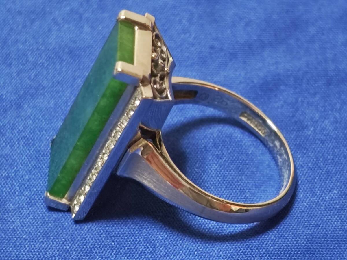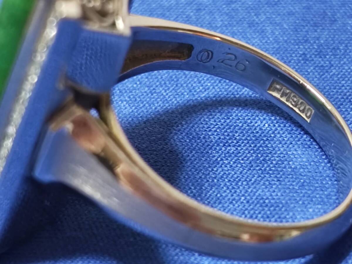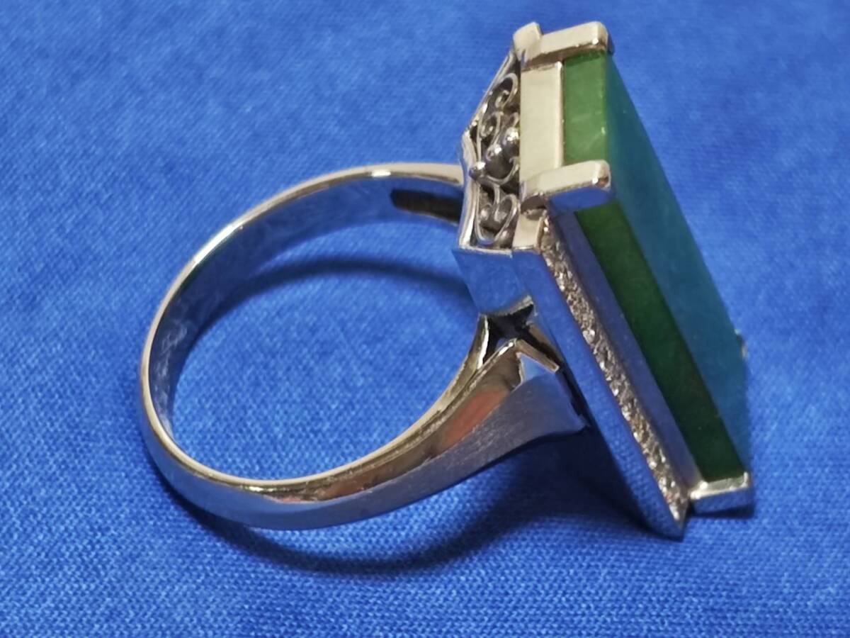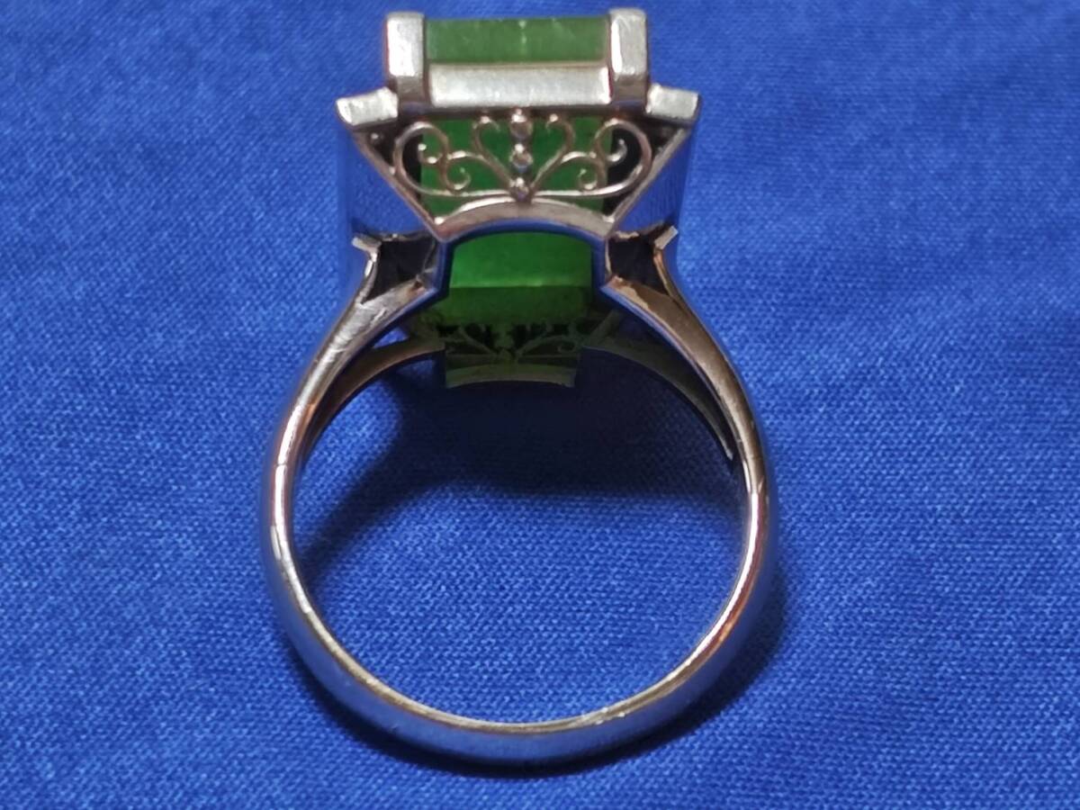 ご縁があり気に入って下さる方がおられましたら♪ 《 天然翡翠 ひすい ~ プラチナ台 プレートカット リング 指輪 》   ☆ 国内正規宝飾店購入品・USED長期保管品(使用頻度少なめ)・状態良好品・宝石鑑別書あり・プレートカット ・サイズ:ヨコ9.22ミリ×タテ22.05ミリ×厚さ1.98ミリ・重量約13g弱  ☆ プラチナ台に22個の天然ダイヤがあしらわれた綺麗な緑色半透明の翡翠リングです。 平成初期ごろに購入したもの(1990年代のためプラチナ表示がPTになる前のPMになっています)で、角型で落ち着いたデザインなので洋装にも和装にもおすすめです。  和のイベントで数回着用後ずっとボックス保管してありました。 お探しの方がおられましたらどうぞ♪  ☆ 目立った汚れや大きなキズはありませんが、使用や経年保管によるスレや小キズはありますので、一度は人の手にあったUSEDヴィンテージ品とご理解いただき画像の現状のまま(フォトの加工は全く施していない素の状態です)ノークレーム&ノーリターンにてご参加下さい。  ☆ 発送方法はおてがる配送の宅急便かゆうパック(いずれも匿名発送)でよろしければ送料は当方が負担します。 よろしくお願いいたします。
