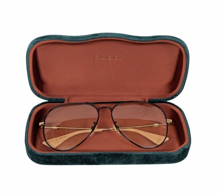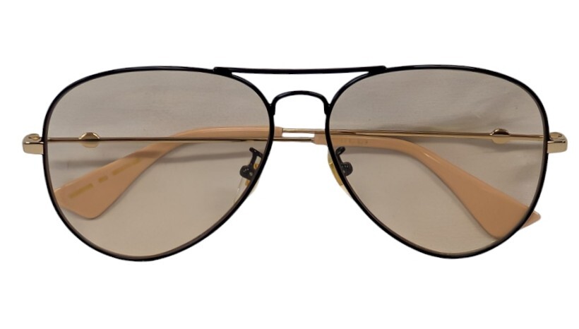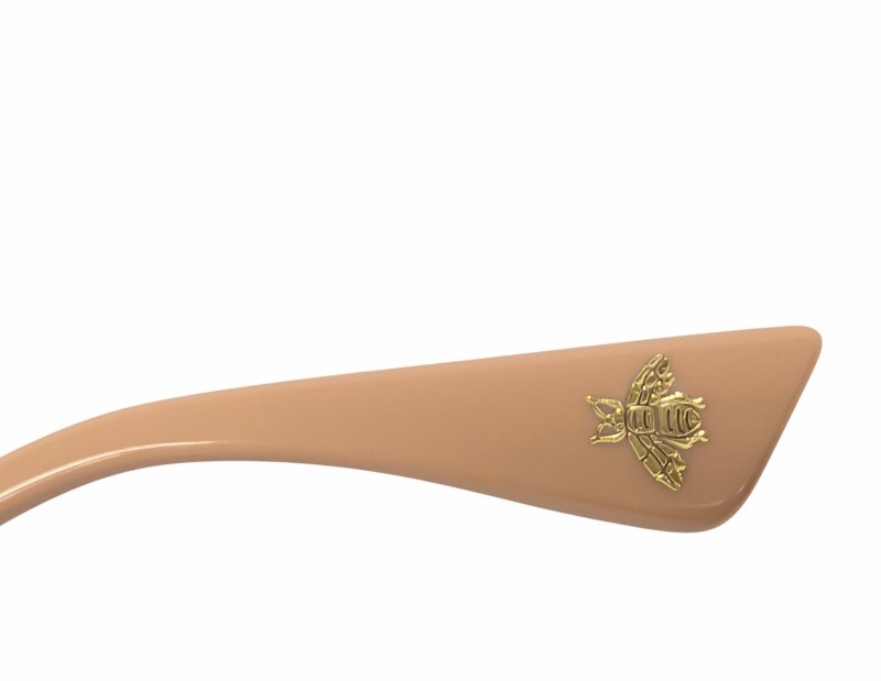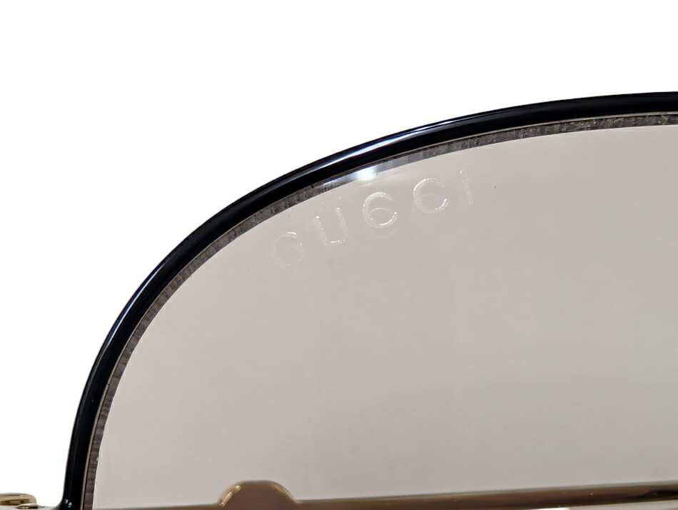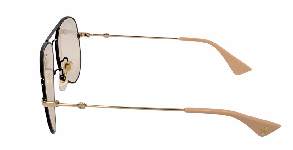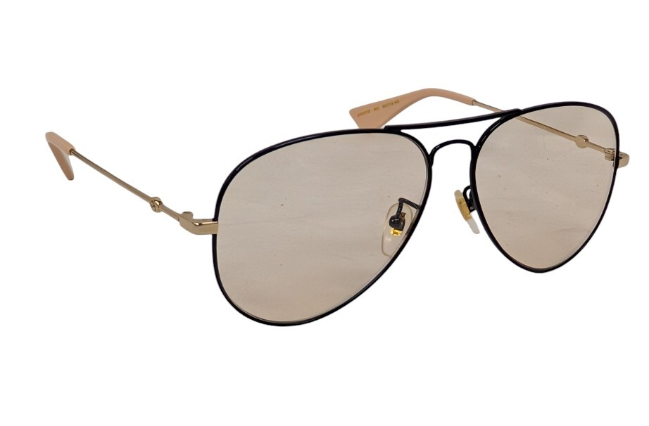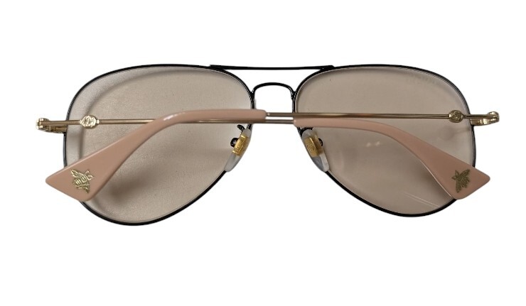 コメント・・・グッチのティアドロップサングラスです。ブラックカラーのフレーム×ゴールドカラーにGGデザインのテンプル×ピンクベージュのモダン部分にはグッチらしいBEEもデザインされています。
