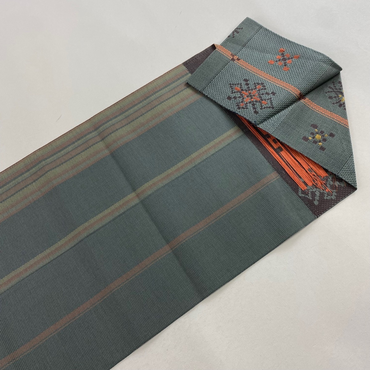 | 名古屋帯 美品 秀品 八寸名古屋帯 松葉仕立て 花 縞 深緑 正絹 【中古】 |