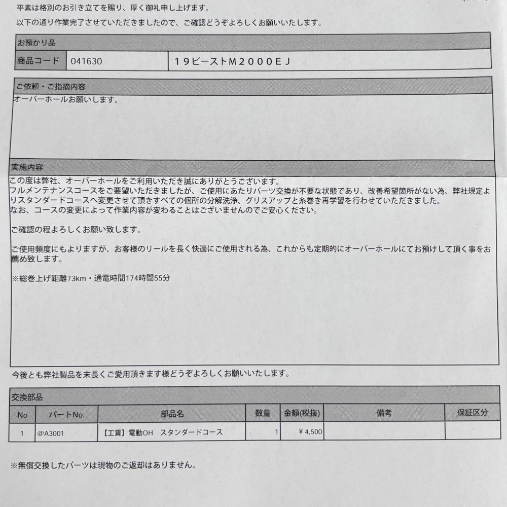 メーカー発行の修理報告書を同封いたします。
