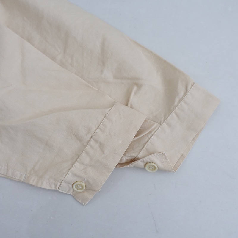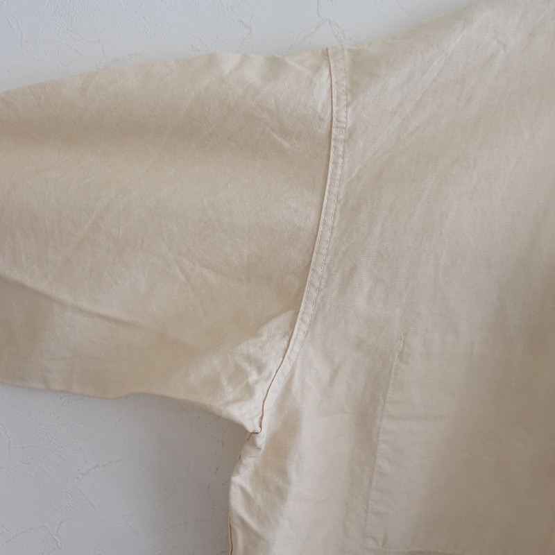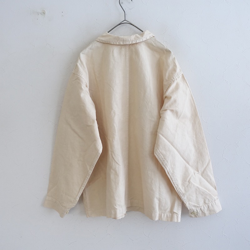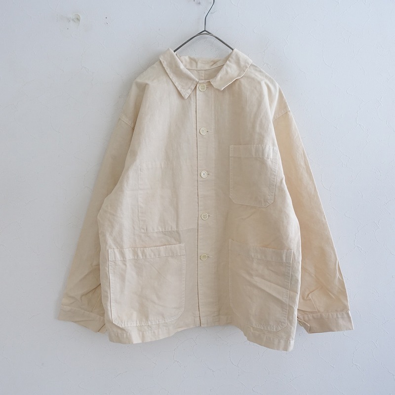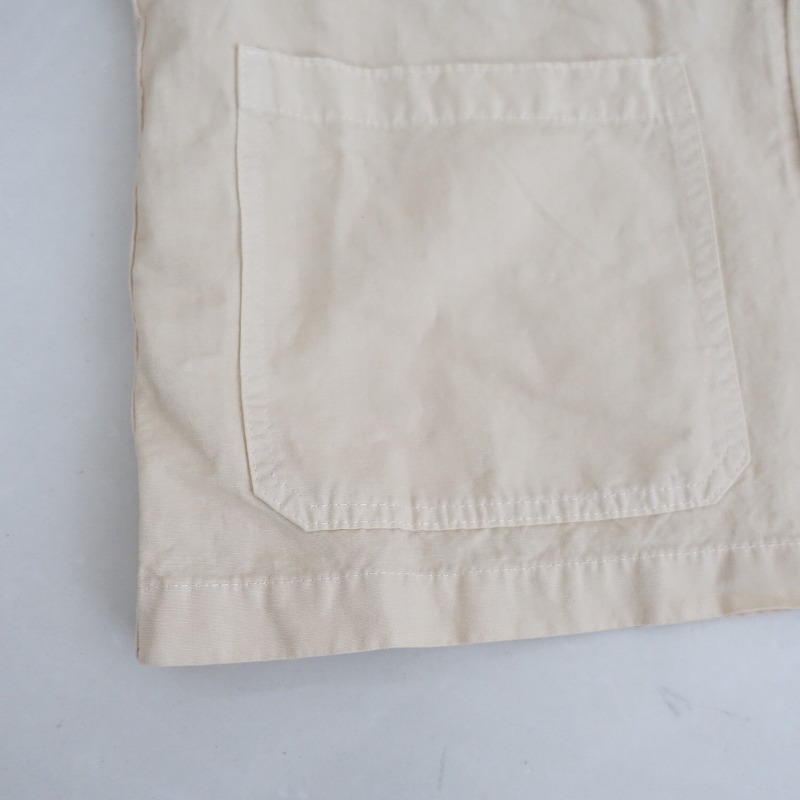 VETRAのコットンリネンジャケットです。カラーはクリームで、やや張りのある生地で仕立てられております。フロントボタン開閉で着脱でき、右胸に内ポケット、表面に3つのパッチポケット付きです。 |