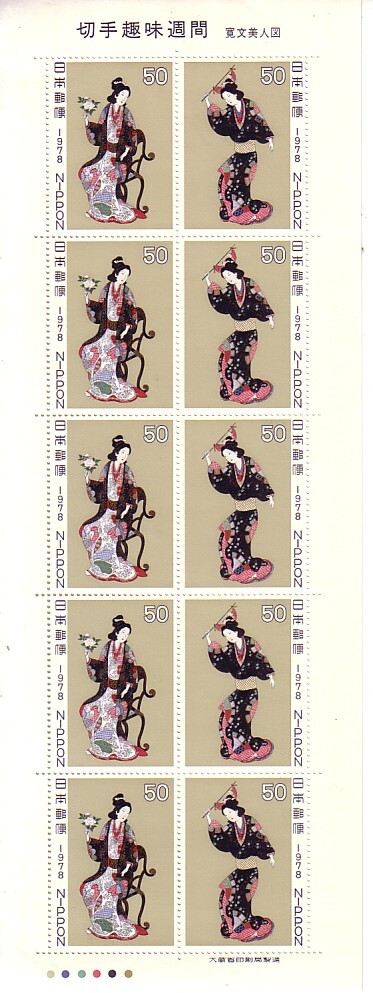 「切手趣味週間1978 寛文美人図」の記念切手です(50円切手X10枚)。送料は普通140円(普通便 複数同梱発送では180円)になります。