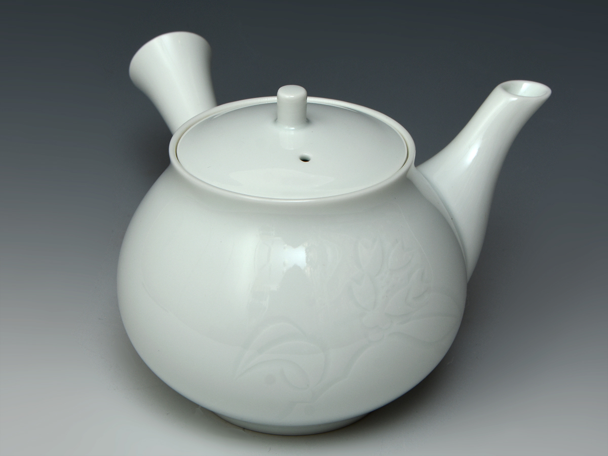 人間国宝 井上萬二 (造) 白磁 彫文 茶器 一揃 / 急須 湯呑 5客/ 共箱 しおり 煎茶道具 茶道具 陶磁器 (検) 伊万里 有田 |