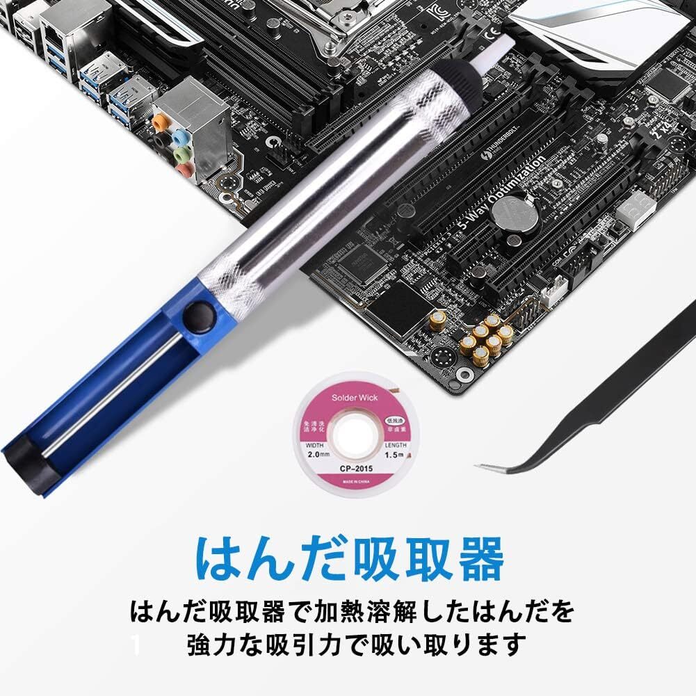 • 1【充実なセット・一個あれば十分】14点セット内容:はんだごて本体×1、高純度はんだ×1、はんだごて台×1、はんだ吸取器×1、はんだ吸取線×1、無酸素銅こて先×5、帯電防止ピン×2、清潔スポンジ×1、日本語取扱説明書×1。電子工作に必要な付属品が全部揃いており、プロジェクトを効率的に完成させるのに役立ちます。別に購入する必要はありません。時間とお金を節約!