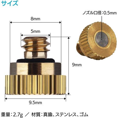 【仕様】サイズ:直径9.5mm×高さ9mm、ネジ径5mm/ノズル口径:.5mm/重量:2.7g/材質:真鍮、ステンレス、ゴム/入数:2個※モニターの環境等により、色の見え方に若干差が生じる場合がございます。
