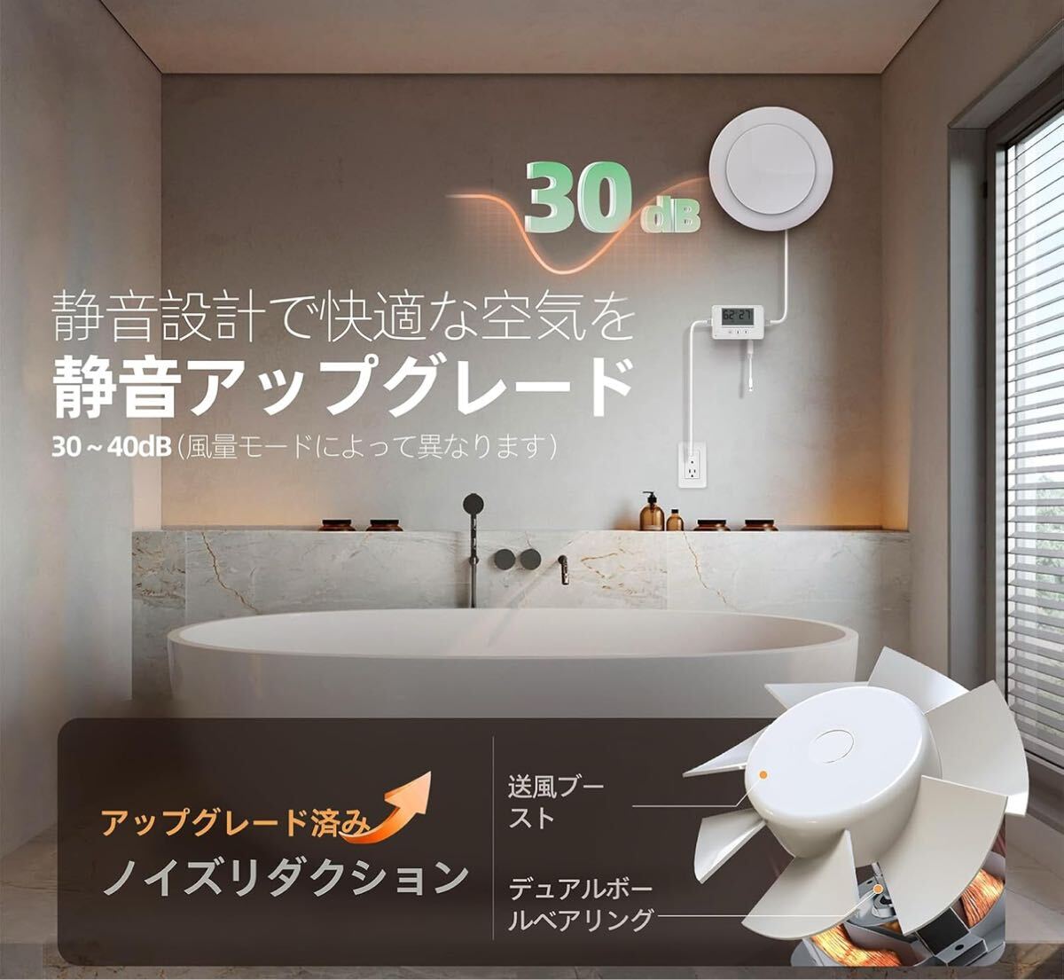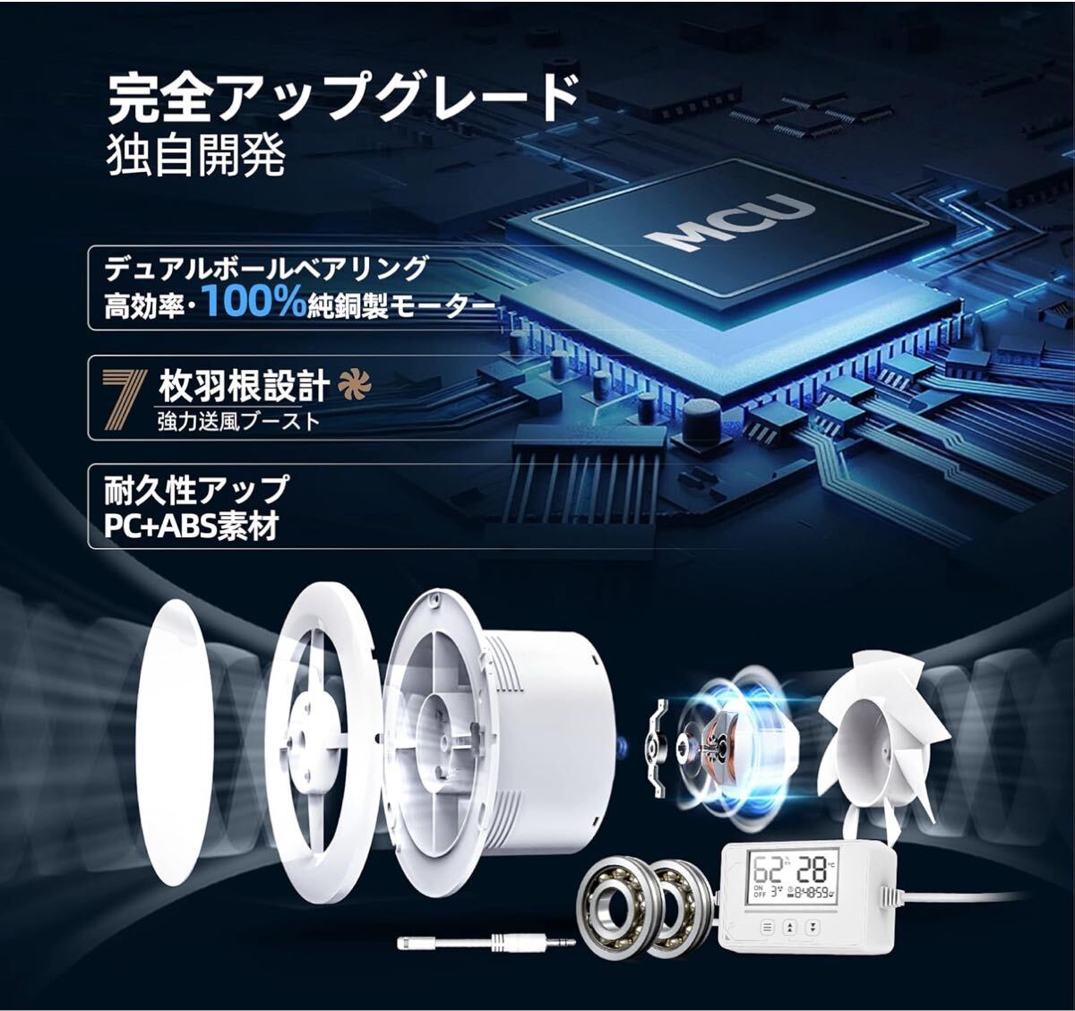 【過熱保護装置&100%純銅モーター】デュアルボールベアリング、銅線50%増量、温度上昇60K。高耐久・高効率で長寿命、安定した性能を実現します。7枚の動的バランスブレードと耐久性の高いPC+ABS構造を採用。三重防音設計により、静かで力強い換気を実現します。
